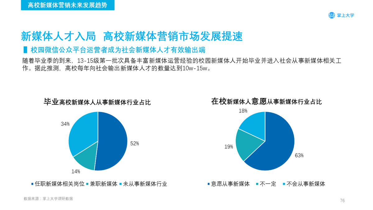根据《掌上大学新媒体蓝皮书2016》2016年高校新媒体运营团队数量在60000个左右,高校新媒体人规模达60万人。当下“大众创业,万众创新”的潮流以及自媒体的爆发,预计2017年高校新媒体人规模将突破100万人。