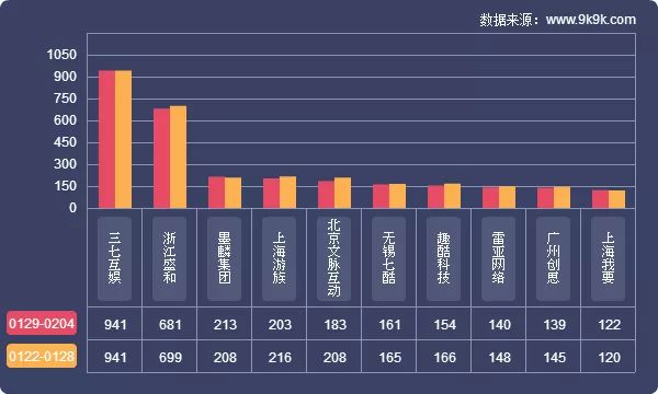 点评:本周网页游戏研发商开服排行前三:三七互娱、浙江盛和、墨麟集团。榜单研发整体开服形势较为稳定,上海我要重回榜单,位列第十。本周榜单研发商共开服2937组,占一线平台开服总数56.9%,较上周增涨3%;其中开服前三研发商共开服1835组,占榜单开服总数62.3%。