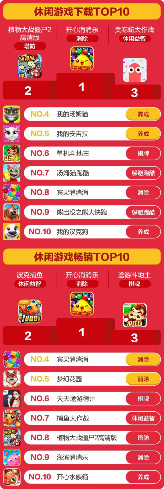 1月份的休闲游戏榜单,还是保持着一如既往的稳定,上榜的产品都是熟悉的面孔。休闲游戏榜单的稳定,源自于游戏本身的特性和玩家群体的稳定性。假日效应对休闲游戏的影响也并不会特别的显著,这一点我们可以从国庆长假后榜单的稳定性推算出来。由于中小学生放假的原因,《我的汤姆猫》、《我的安吉拉》等游戏可能会出现一定的涨幅,但对于整体榜单的影响并不大。