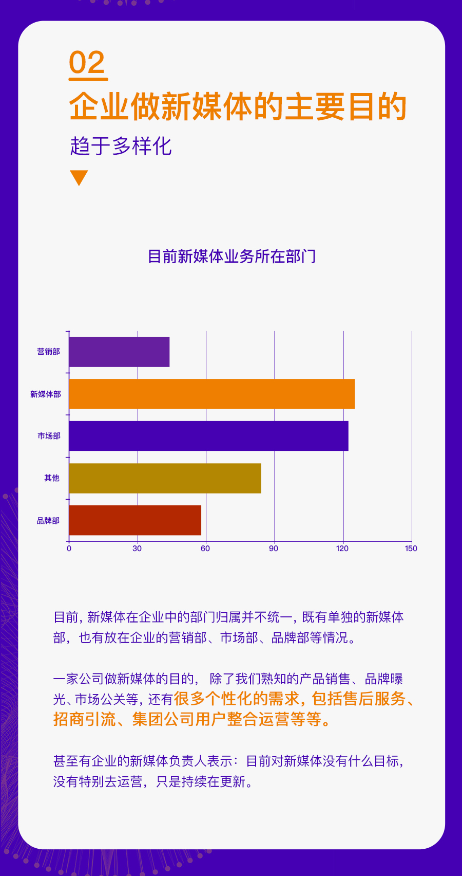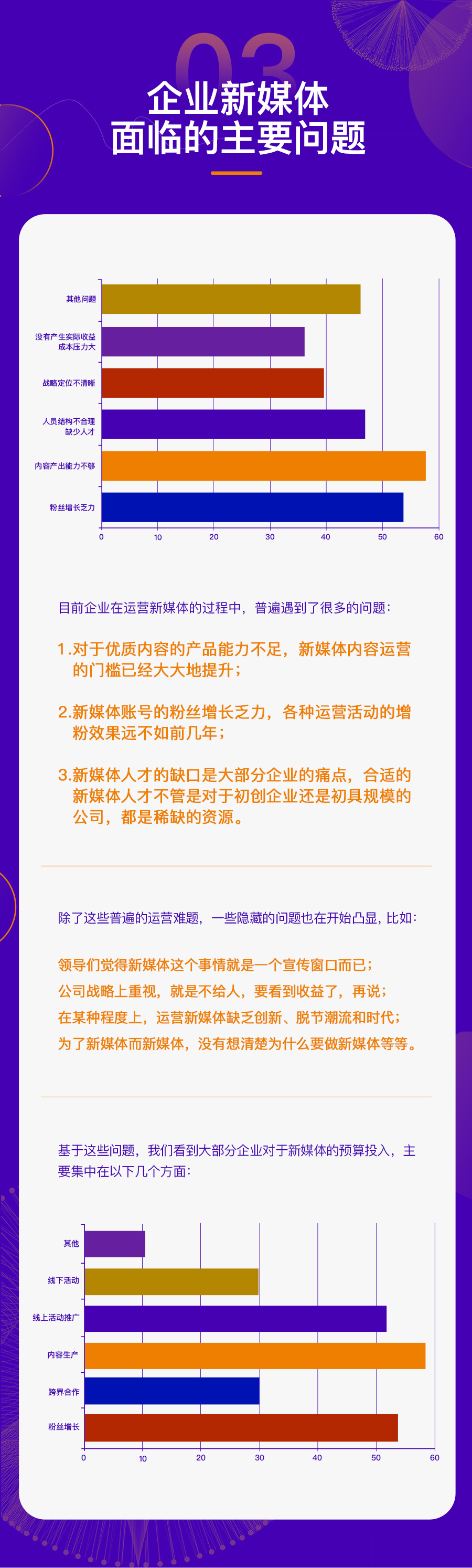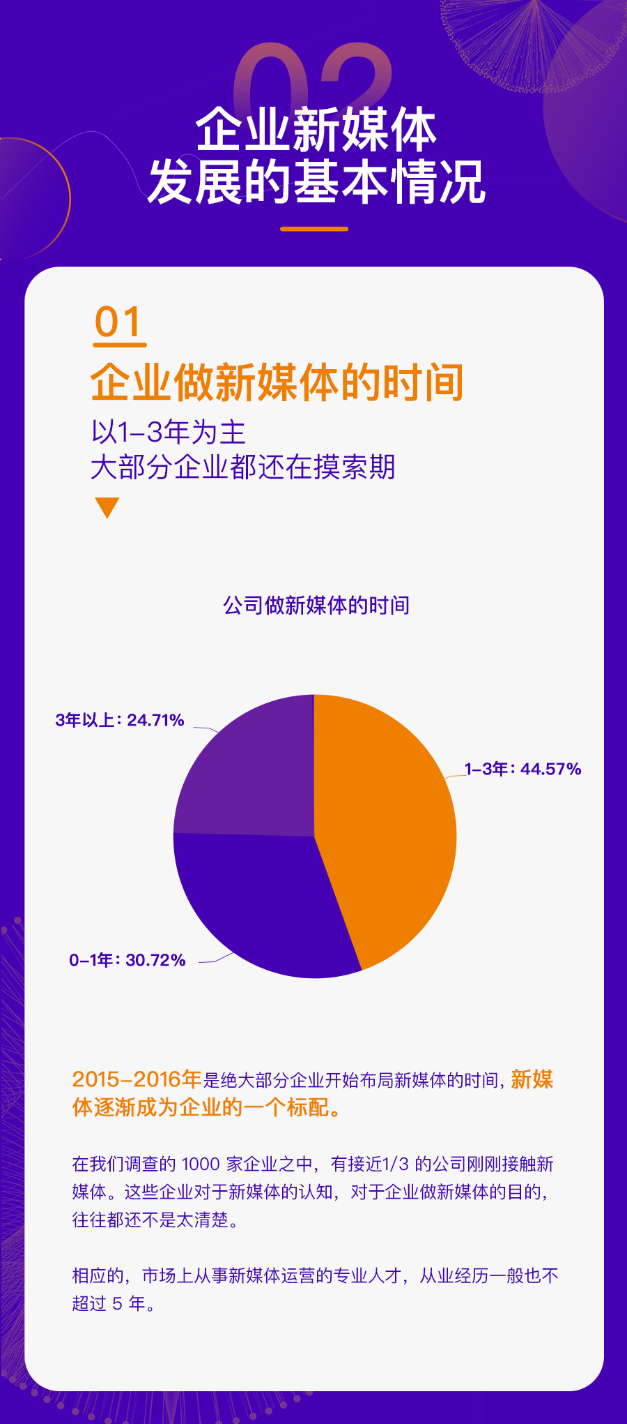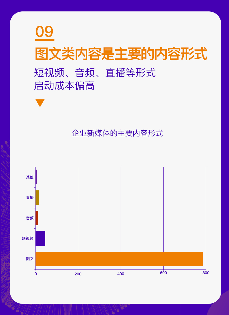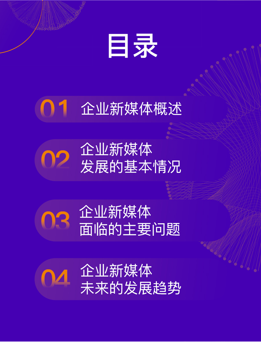 这些企业既包括 500 人以上规模化的公司,也有 50 人以内的初创企业;既有北上广深一线城市的互联网企业,也有非省会城市的传统公司。通过对这些企业运营新媒体的现状分析,我们找到了一些普遍性的问题,也对于企业新媒体接下来的发展趋势更加清晰。