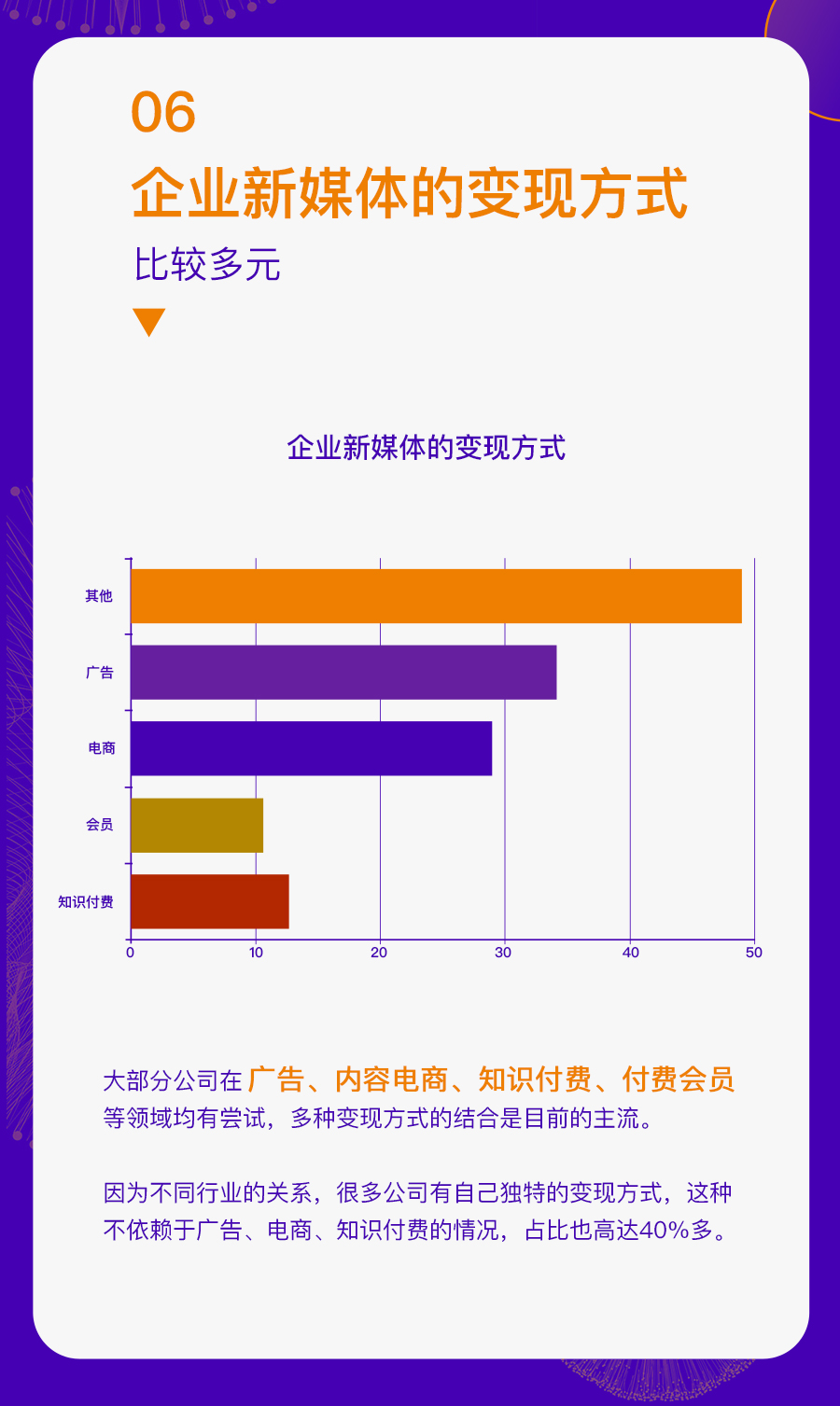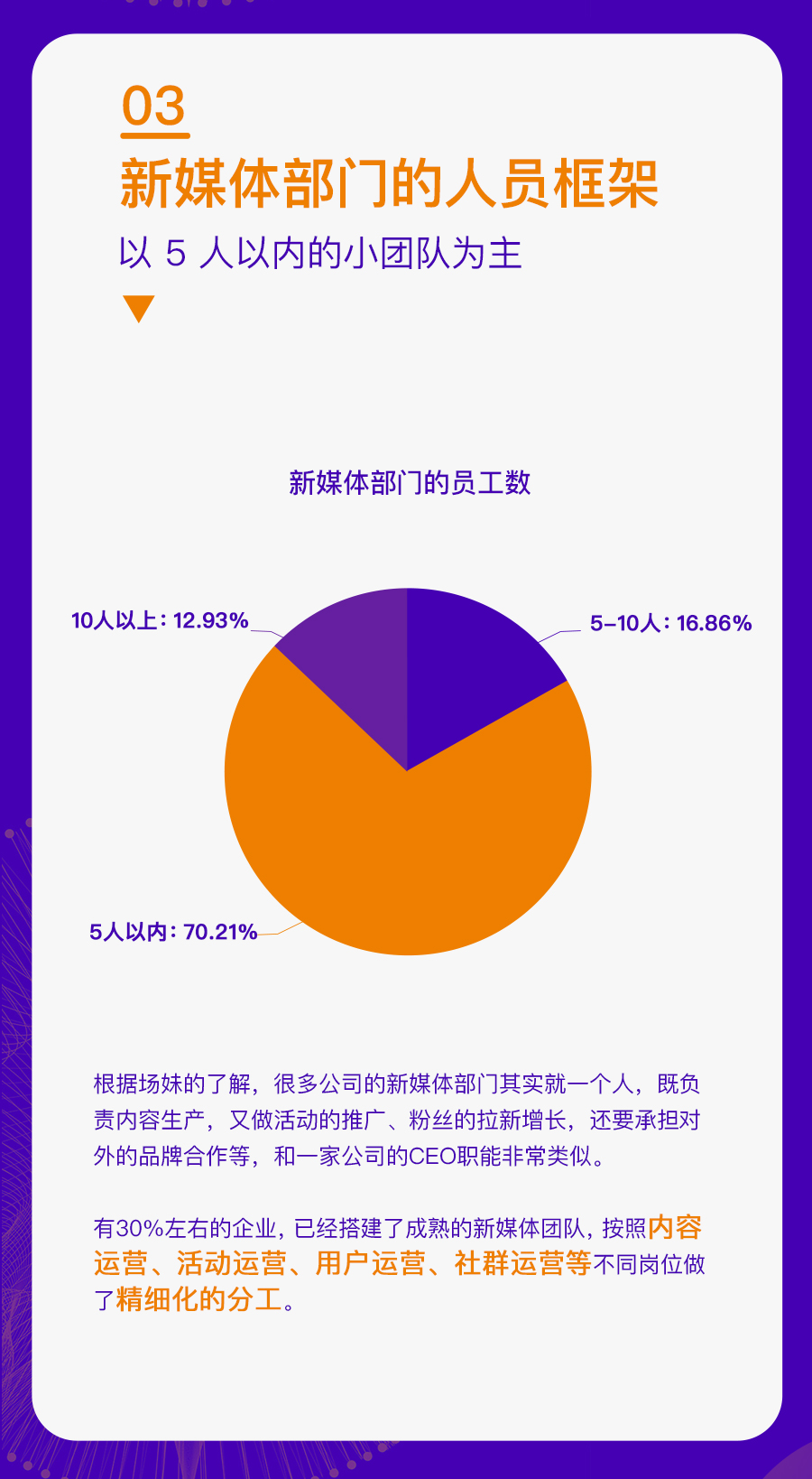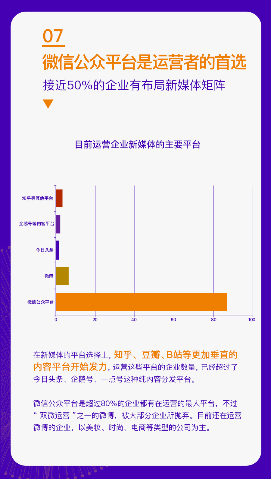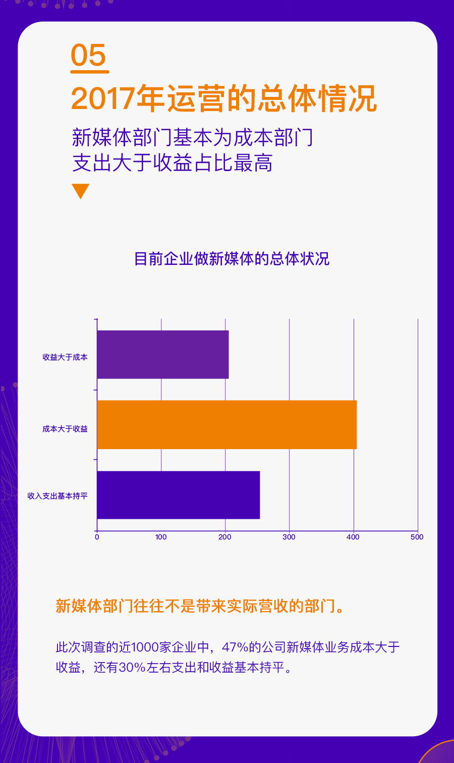 这些企业既包括 500 人以上规模化的公司,也有 50 人以内的初创企业;既有北上广深一线城市的互联网企业,也有非省会城市的传统公司。通过对这些企业运营新媒体的现状分析,我们找到了一些普遍性的问题,也对于企业新媒体接下来的发展趋势更加清晰。
