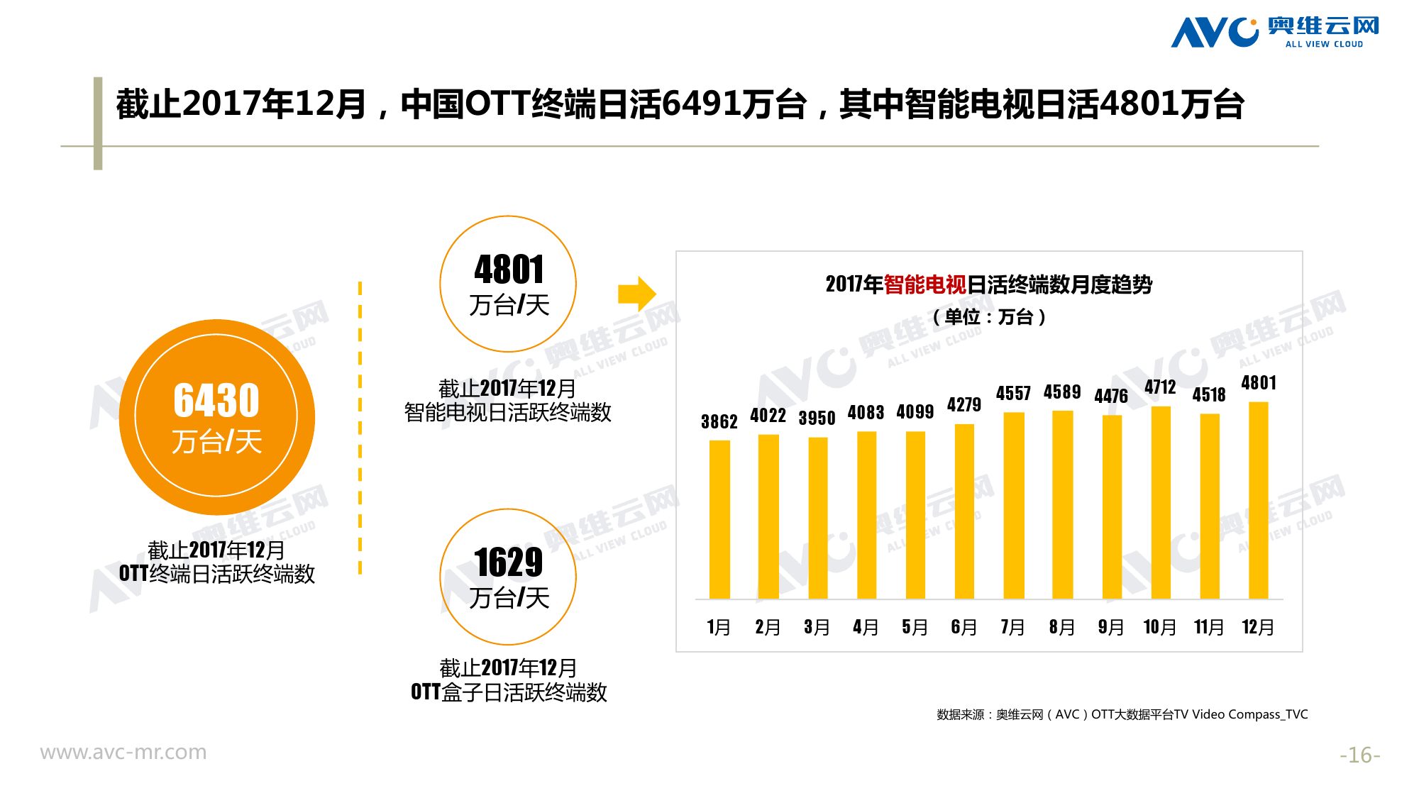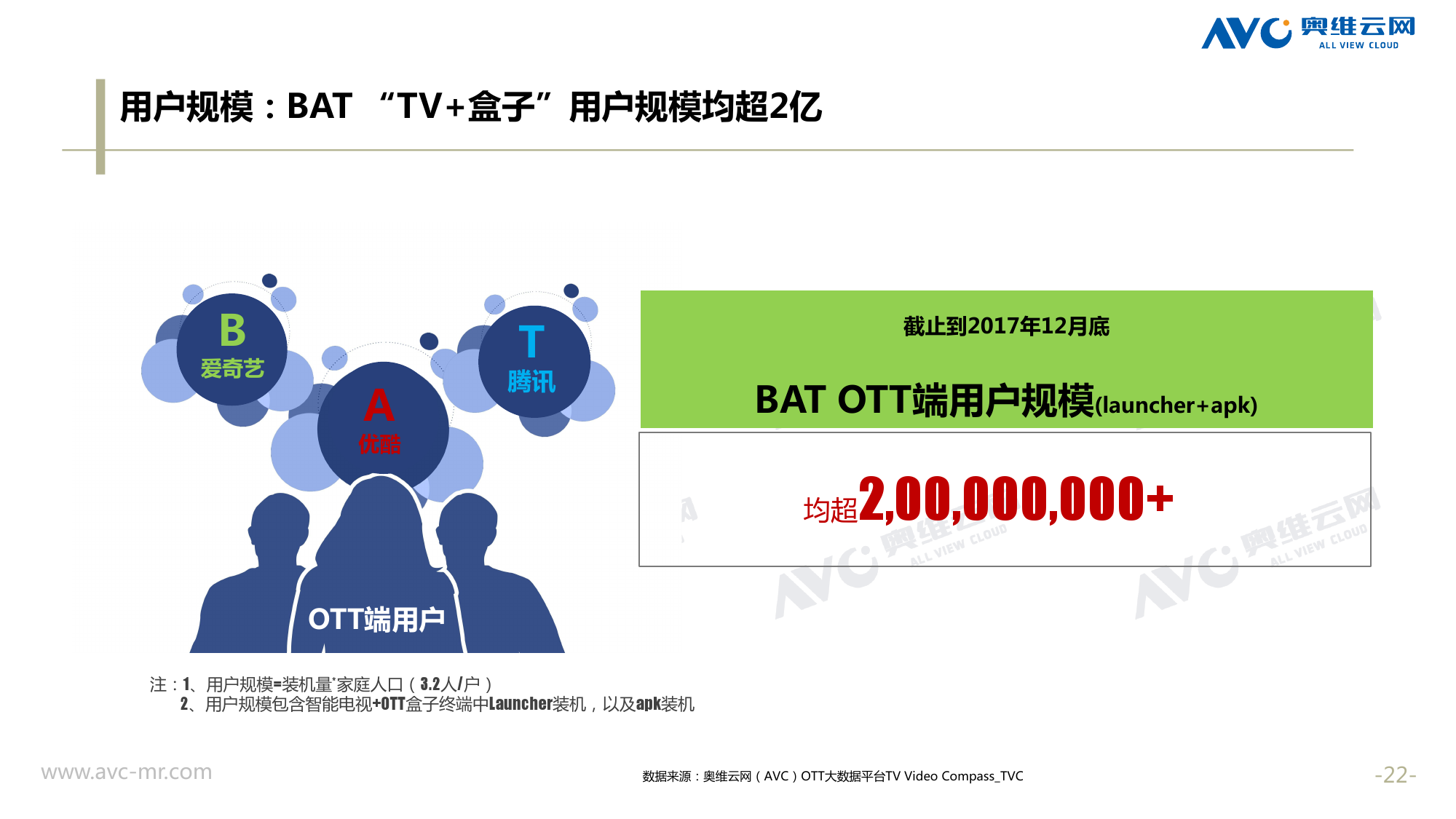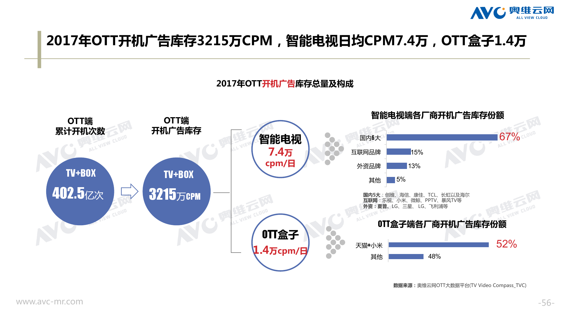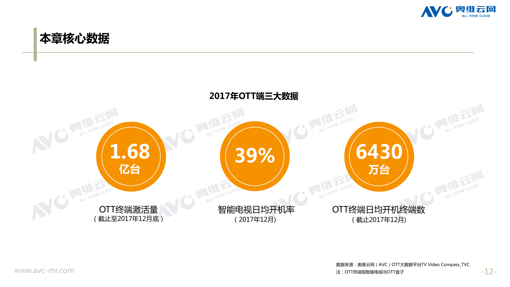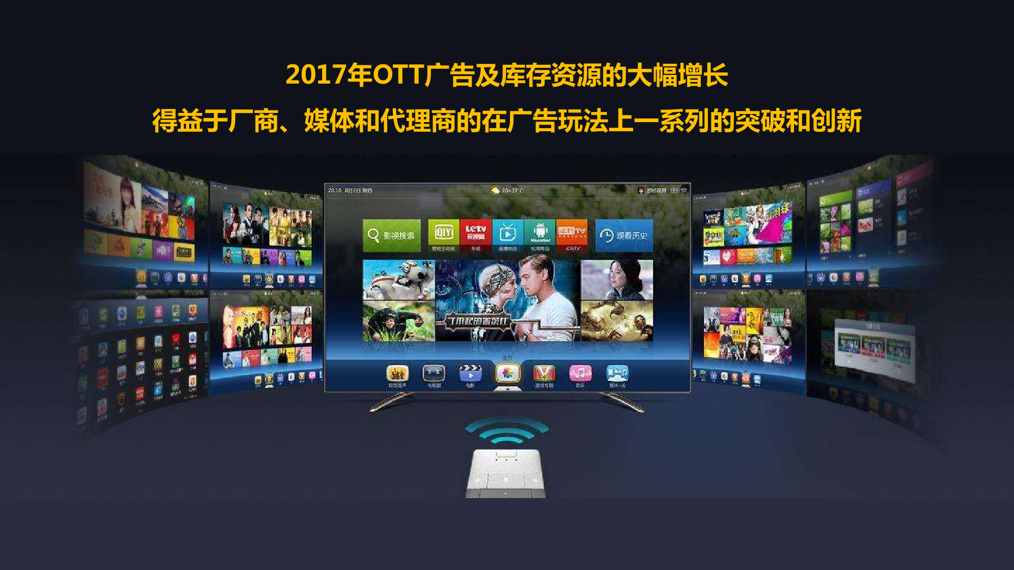 奥维云网:2018年中国OTT发展预测报告 《2018年中国OTT发展预测报告》,报告多维度分析了2017年OTT市场宏观发展环境分析、终端规模、 运营方向、广告投放趋势、资源价值变化,并对2018年的发展做出前瞻性预测。 PDF版本将分享到199IT交流群,199IT感谢您的支持! 更多阅读:奥维云网:2015年10月份中国OTT发展研究奥维云网:2016年第一周OTT盒子销量为14.9万台奥维云网:2015年11月中国OTT指数报告奥维云网 :2016年10月24日-10月30日OTT盒子观察报告奥维云网:2017年中OTT运营大数据蓝皮书奥维云网:2018年4月OTT大屏用户行为月报奥维云网:2017年度OTT全量数据排行榜奥维云网:2017年2月20日-26日OTT盒子观察报告奥维云网发布17年中OTT大数据蓝皮书: OTT用户月活终端8112万台同比增17.9%尼尔森:中国智能电视用户全样本收视行为及OTT广告价值研究奥维云网:2016年2月22日-2月28日OTT盒子观察报告奥维云网:2019年8月中国彩电市场简析奥维云网:2015年4月-9月线上智能电视盒大数据奥维云网:2016上半年中国OTT盒子市场分析及预测奥维云网:2019年Q1中国洗衣机市场总结报告