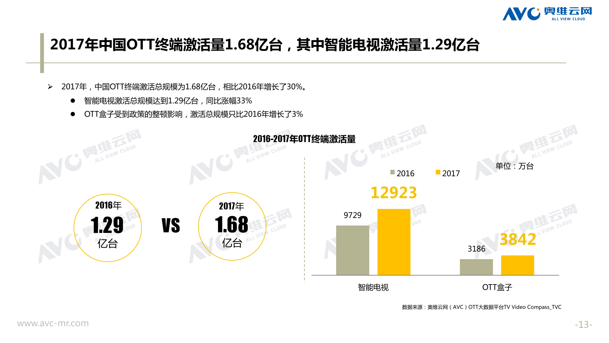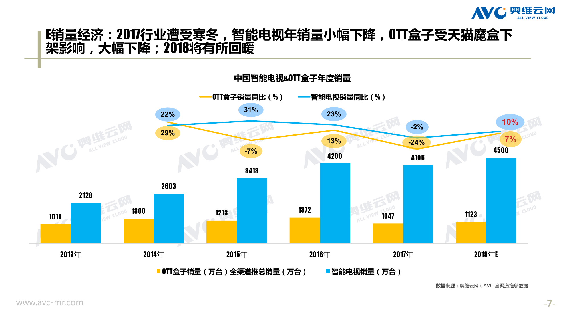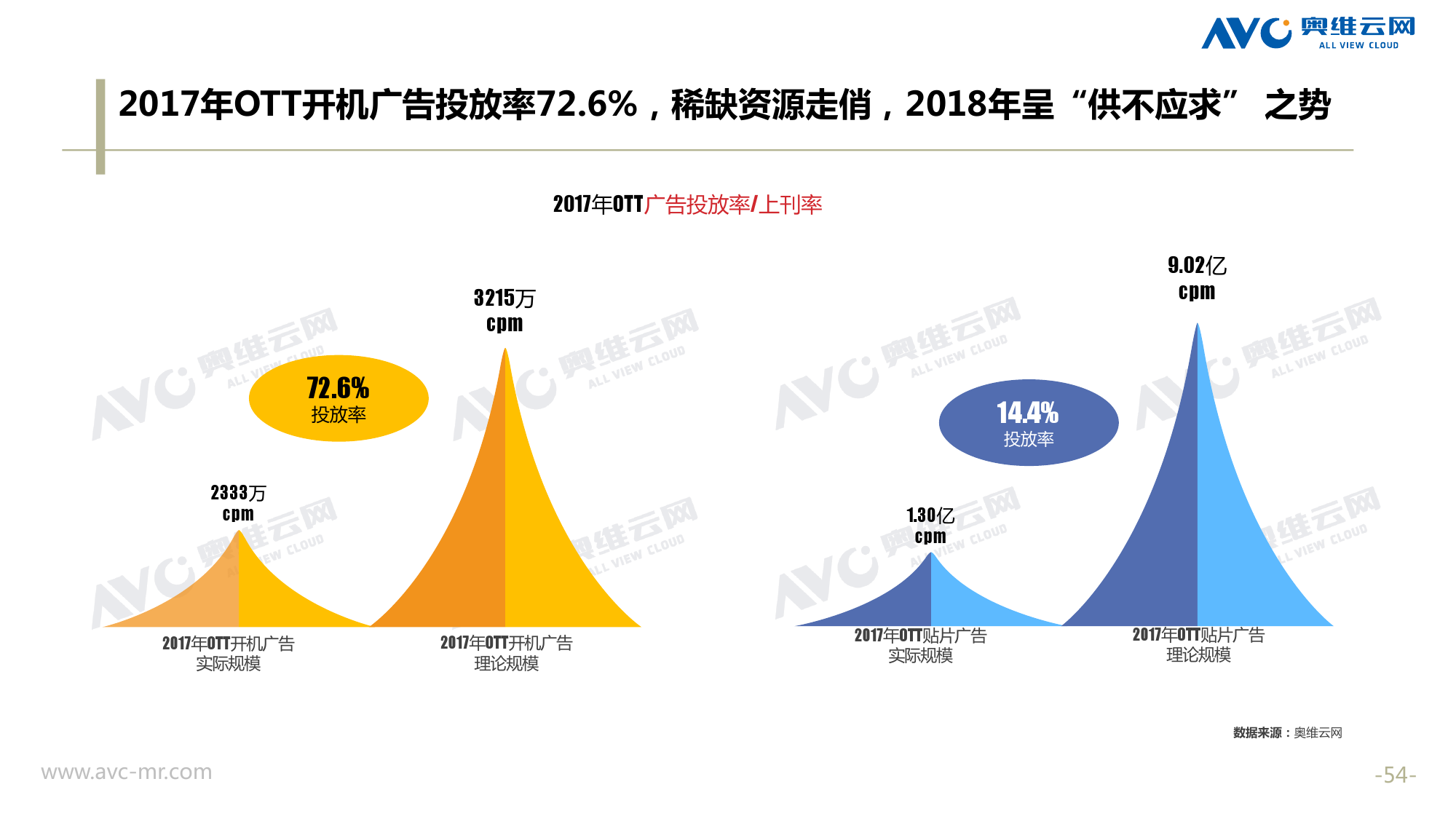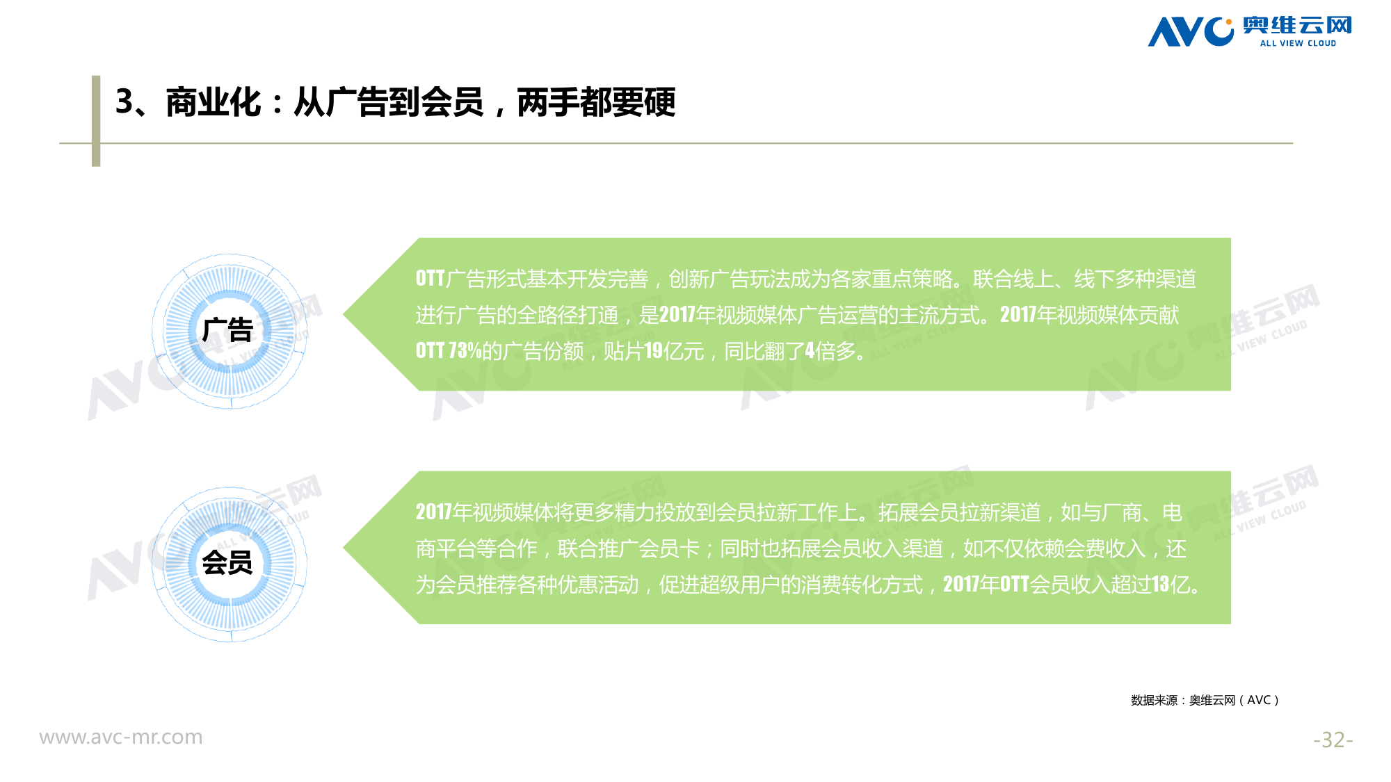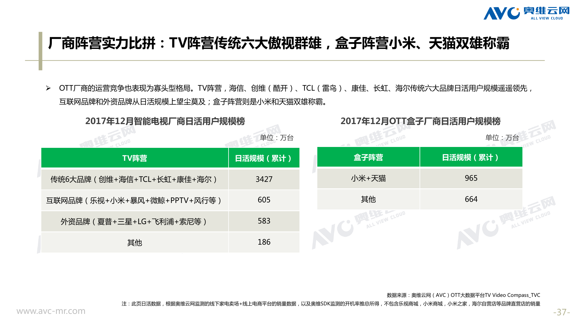 奥维云网:2018年中国OTT发展预测报告 《2018年中国OTT发展预测报告》,报告多维度分析了2017年OTT市场宏观发展环境分析、终端规模、 运营方向、广告投放趋势、资源价值变化,并对2018年的发展做出前瞻性预测。 PDF版本将分享到199IT交流群,199IT感谢您的支持! 更多阅读:奥维云网:2015年10月份中国OTT发展研究奥维云网:2016年第一周OTT盒子销量为14.9万台奥维云网:2015年11月中国OTT指数报告奥维云网 :2016年10月24日-10月30日OTT盒子观察报告奥维云网:2017年中OTT运营大数据蓝皮书奥维云网:2018年4月OTT大屏用户行为月报奥维云网:2017年度OTT全量数据排行榜奥维云网:2017年2月20日-26日OTT盒子观察报告奥维云网发布17年中OTT大数据蓝皮书: OTT用户月活终端8112万台同比增17.9%尼尔森:中国智能电视用户全样本收视行为及OTT广告价值研究奥维云网:2016年2月22日-2月28日OTT盒子观察报告奥维云网:2019年8月中国彩电市场简析奥维云网:2015年4月-9月线上智能电视盒大数据奥维云网:2016上半年中国OTT盒子市场分析及预测奥维云网:2019年Q1中国洗衣机市场总结报告