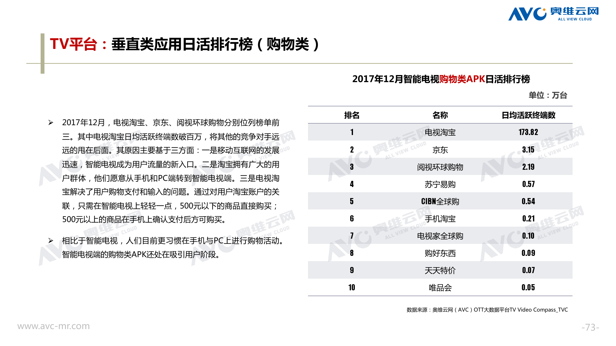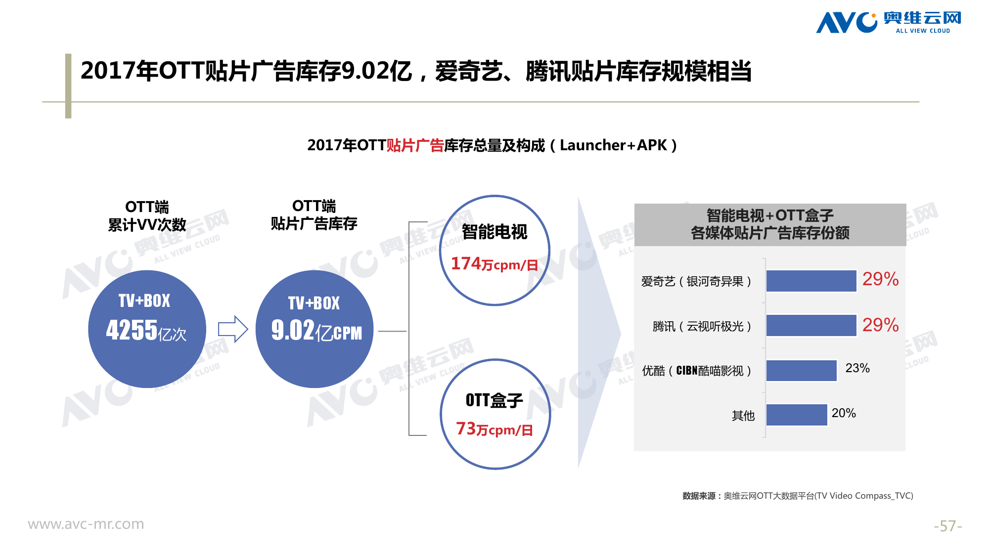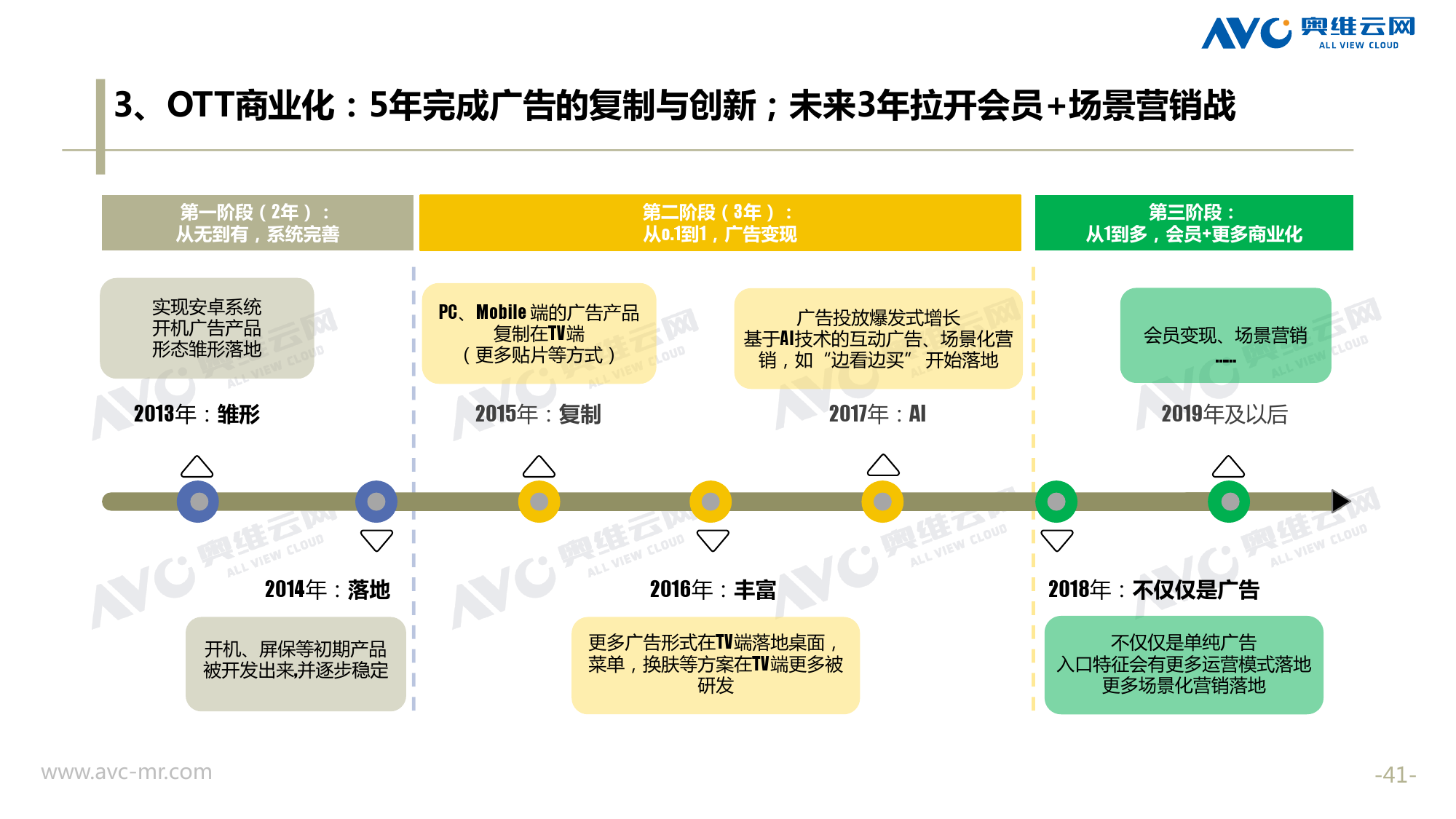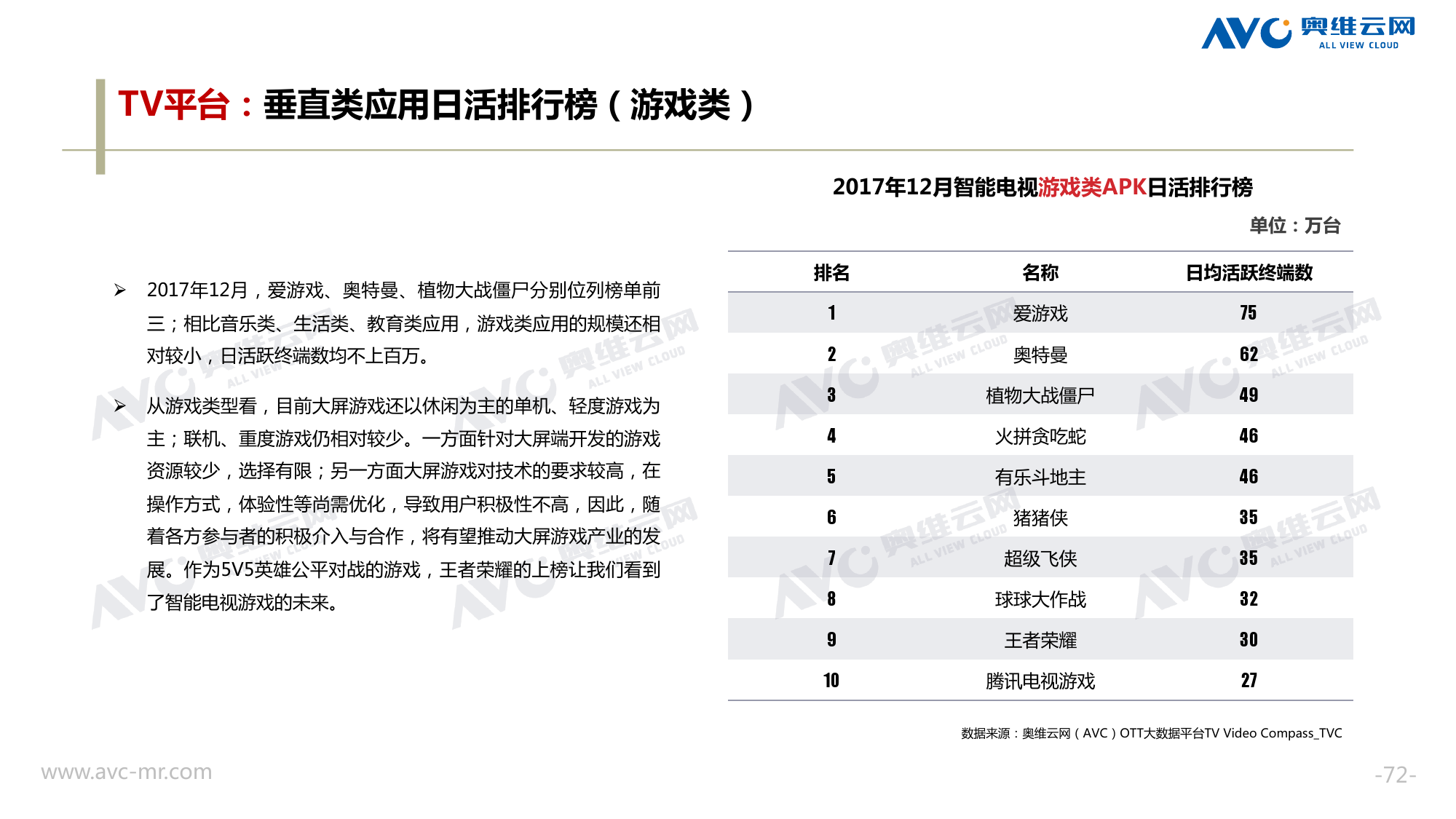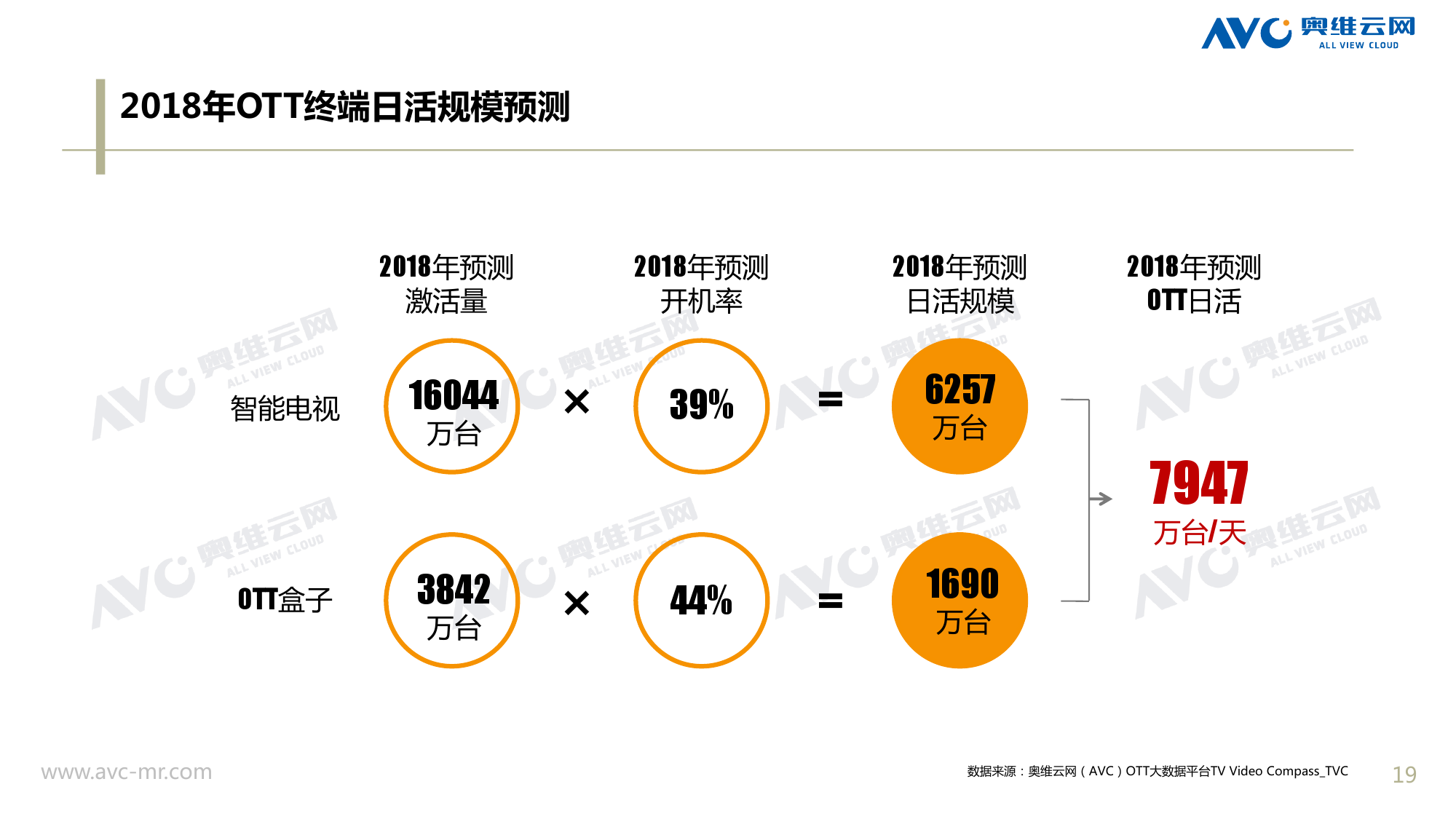 奥维云网:2018年中国OTT发展预测报告 《2018年中国OTT发展预测报告》,报告多维度分析了2017年OTT市场宏观发展环境分析、终端规模、 运营方向、广告投放趋势、资源价值变化,并对2018年的发展做出前瞻性预测。 PDF版本将分享到199IT交流群,199IT感谢您的支持! 更多阅读:奥维云网:2015年10月份中国OTT发展研究奥维云网:2016年第一周OTT盒子销量为14.9万台奥维云网:2015年11月中国OTT指数报告奥维云网 :2016年10月24日-10月30日OTT盒子观察报告奥维云网:2017年中OTT运营大数据蓝皮书奥维云网:2018年4月OTT大屏用户行为月报奥维云网:2017年度OTT全量数据排行榜奥维云网:2017年2月20日-26日OTT盒子观察报告奥维云网发布17年中OTT大数据蓝皮书: OTT用户月活终端8112万台同比增17.9%尼尔森:中国智能电视用户全样本收视行为及OTT广告价值研究奥维云网:2016年2月22日-2月28日OTT盒子观察报告奥维云网:2019年8月中国彩电市场简析奥维云网:2015年4月-9月线上智能电视盒大数据奥维云网:2016上半年中国OTT盒子市场分析及预测奥维云网:2019年Q1中国洗衣机市场总结报告