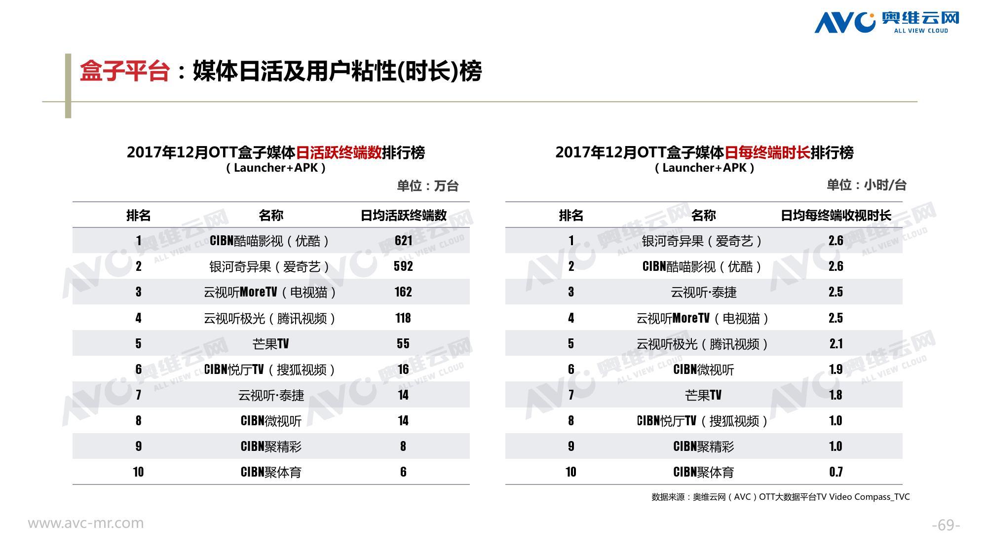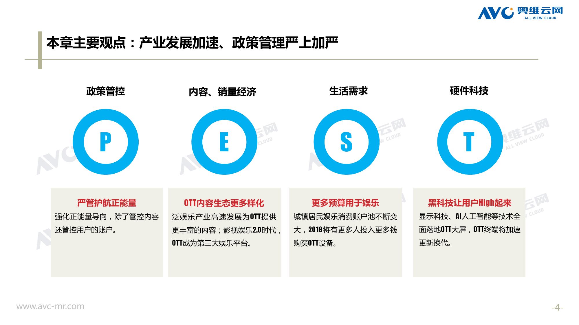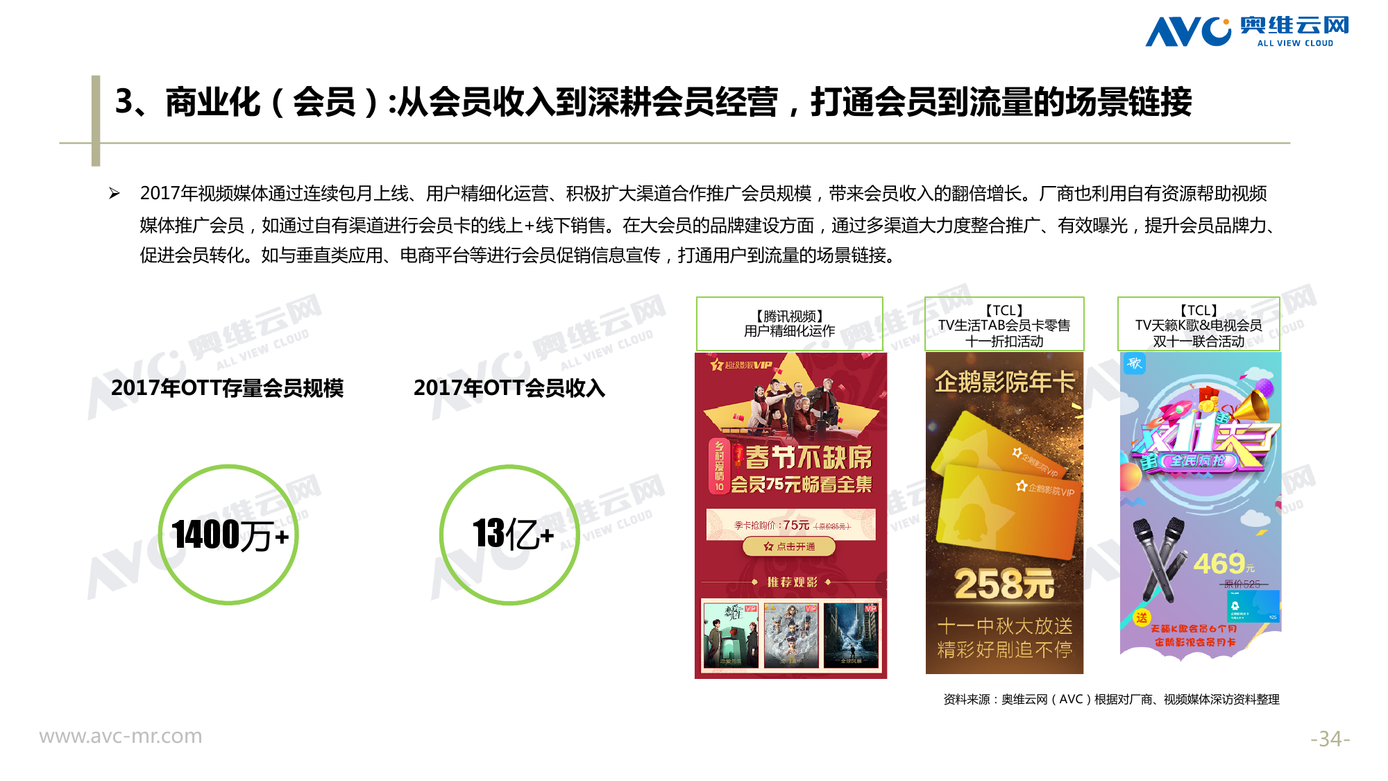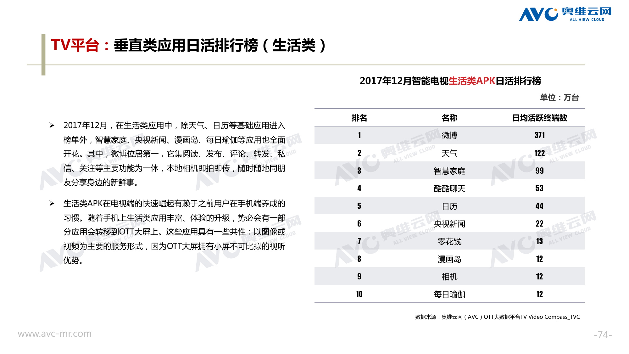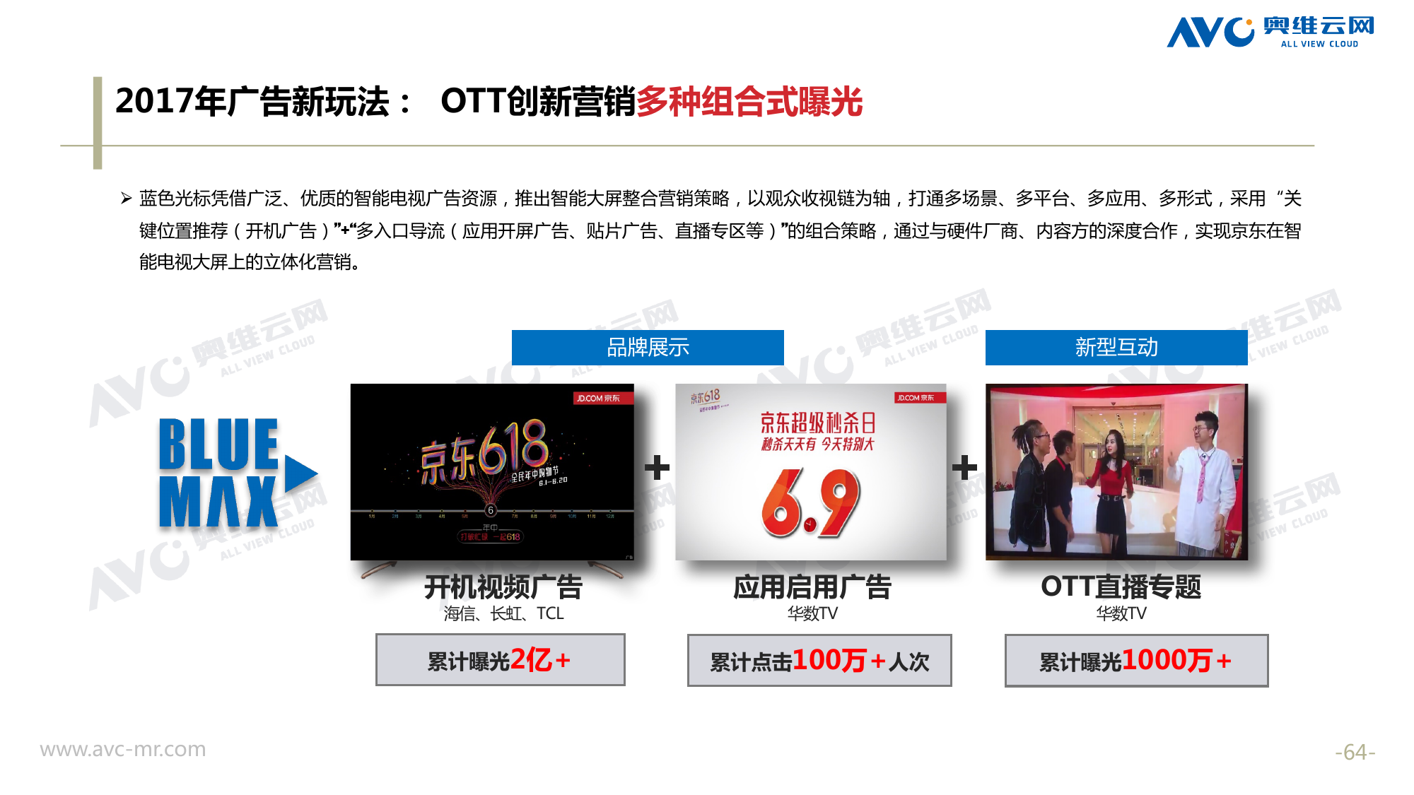 奥维云网:2018年中国OTT发展预测报告 《2018年中国OTT发展预测报告》,报告多维度分析了2017年OTT市场宏观发展环境分析、终端规模、 运营方向、广告投放趋势、资源价值变化,并对2018年的发展做出前瞻性预测。 PDF版本将分享到199IT交流群,199IT感谢您的支持! 更多阅读:奥维云网:2015年10月份中国OTT发展研究奥维云网:2016年第一周OTT盒子销量为14.9万台奥维云网:2015年11月中国OTT指数报告奥维云网 :2016年10月24日-10月30日OTT盒子观察报告奥维云网:2017年中OTT运营大数据蓝皮书奥维云网:2018年4月OTT大屏用户行为月报奥维云网:2017年度OTT全量数据排行榜奥维云网:2017年2月20日-26日OTT盒子观察报告奥维云网发布17年中OTT大数据蓝皮书: OTT用户月活终端8112万台同比增17.9%尼尔森:中国智能电视用户全样本收视行为及OTT广告价值研究奥维云网:2016年2月22日-2月28日OTT盒子观察报告奥维云网:2019年8月中国彩电市场简析奥维云网:2015年4月-9月线上智能电视盒大数据奥维云网:2016上半年中国OTT盒子市场分析及预测奥维云网:2019年Q1中国洗衣机市场总结报告