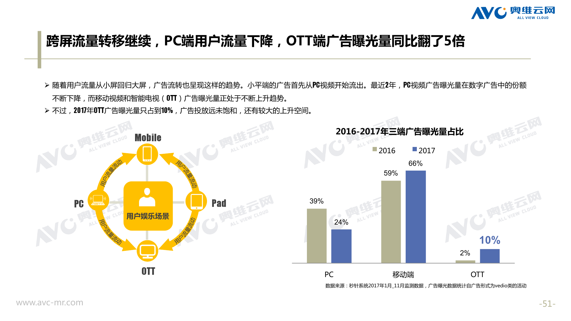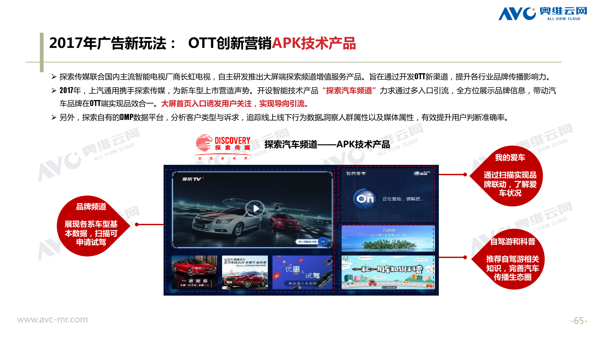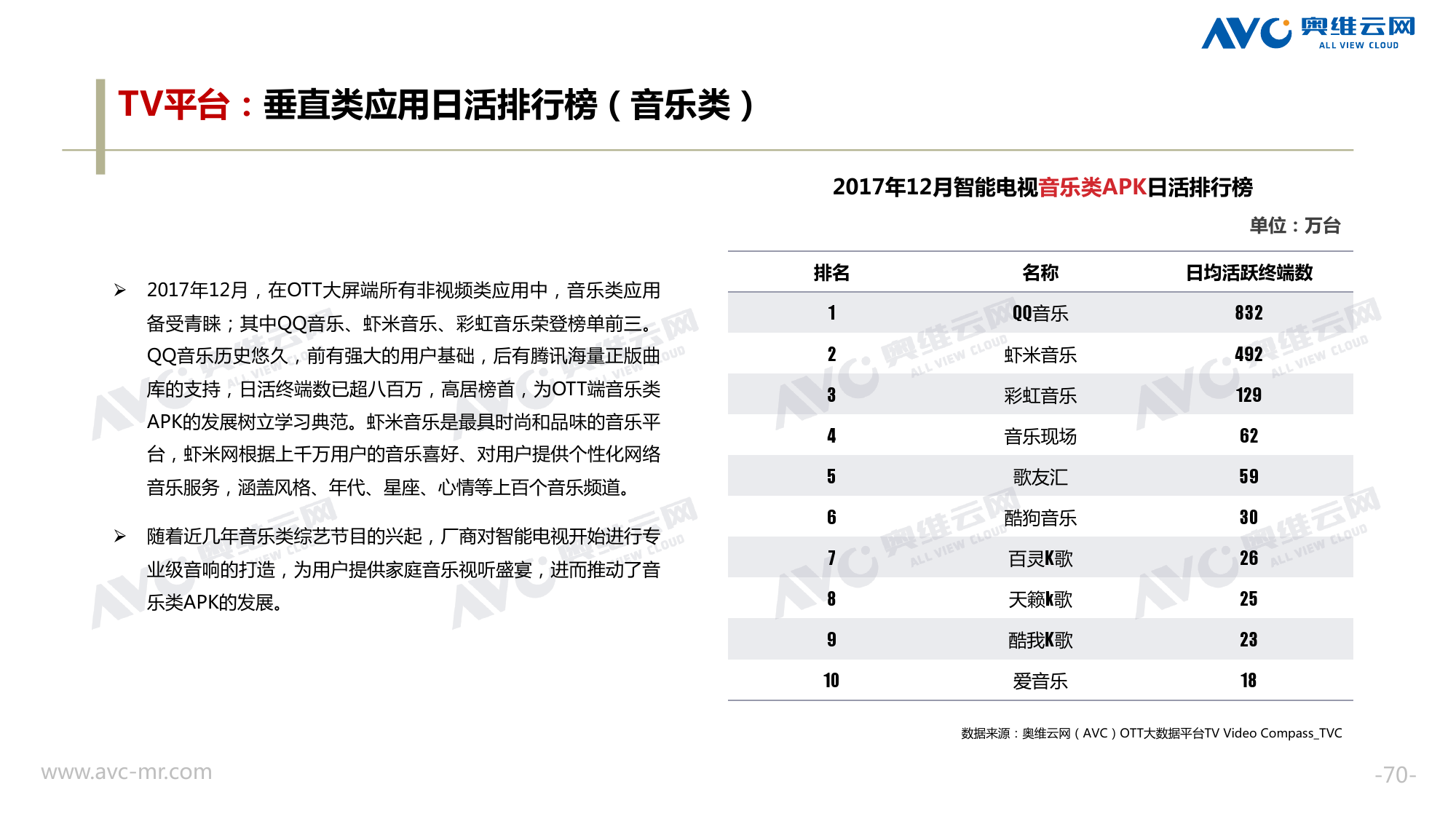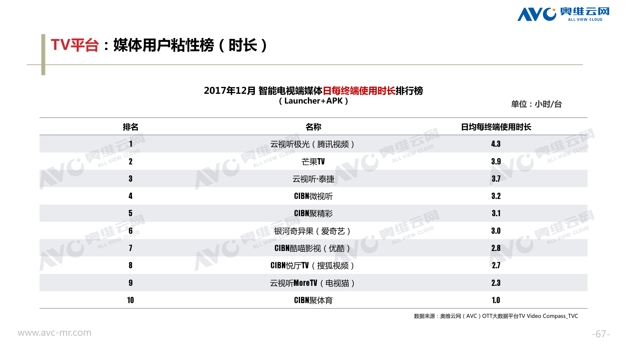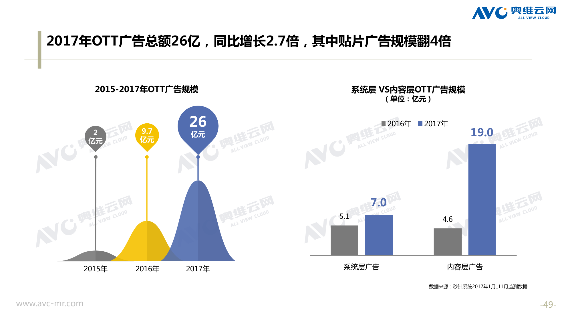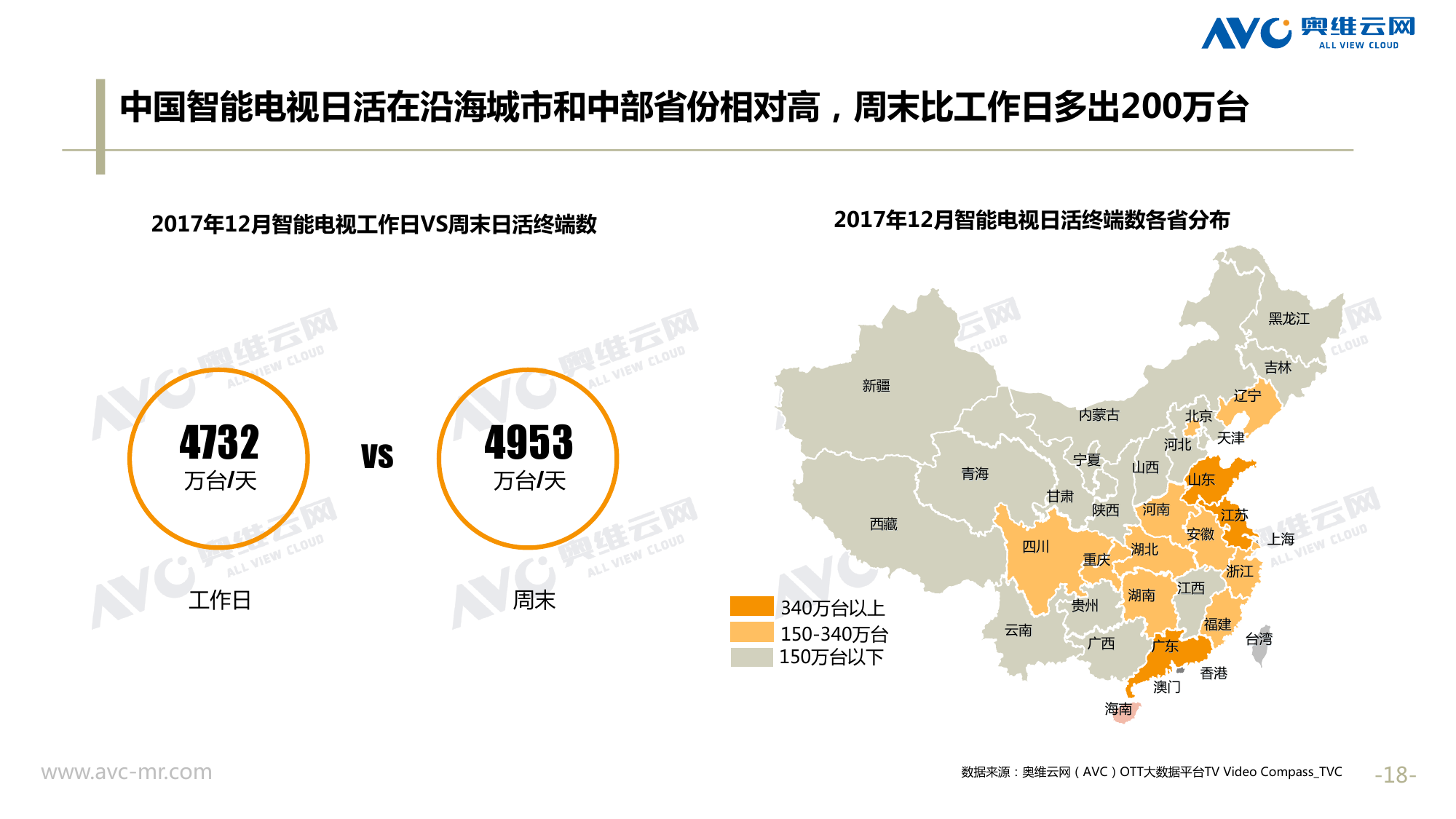 奥维云网:2018年中国OTT发展预测报告 《2018年中国OTT发展预测报告》,报告多维度分析了2017年OTT市场宏观发展环境分析、终端规模、 运营方向、广告投放趋势、资源价值变化,并对2018年的发展做出前瞻性预测。 PDF版本将分享到199IT交流群,199IT感谢您的支持! 更多阅读:奥维云网:2015年10月份中国OTT发展研究奥维云网:2016年第一周OTT盒子销量为14.9万台奥维云网:2015年11月中国OTT指数报告奥维云网 :2016年10月24日-10月30日OTT盒子观察报告奥维云网:2017年中OTT运营大数据蓝皮书奥维云网:2018年4月OTT大屏用户行为月报奥维云网:2017年度OTT全量数据排行榜奥维云网:2017年2月20日-26日OTT盒子观察报告奥维云网发布17年中OTT大数据蓝皮书: OTT用户月活终端8112万台同比增17.9%尼尔森:中国智能电视用户全样本收视行为及OTT广告价值研究奥维云网:2016年2月22日-2月28日OTT盒子观察报告奥维云网:2019年8月中国彩电市场简析奥维云网:2015年4月-9月线上智能电视盒大数据奥维云网:2016上半年中国OTT盒子市场分析及预测奥维云网:2019年Q1中国洗衣机市场总结报告