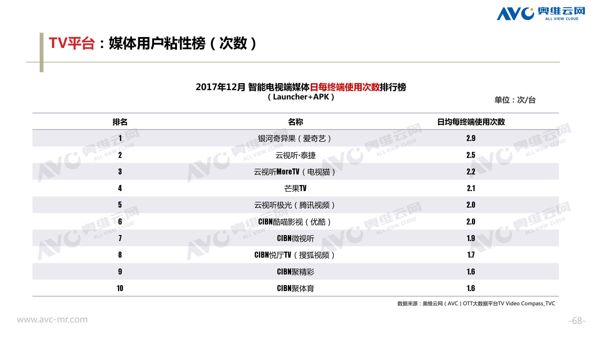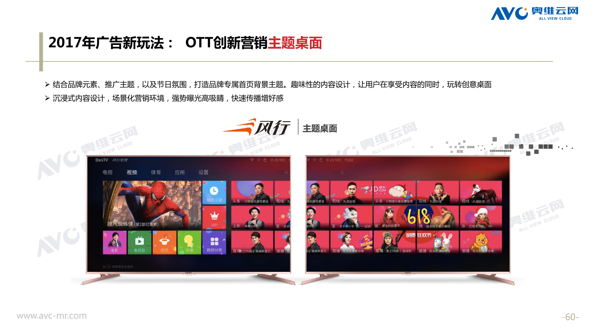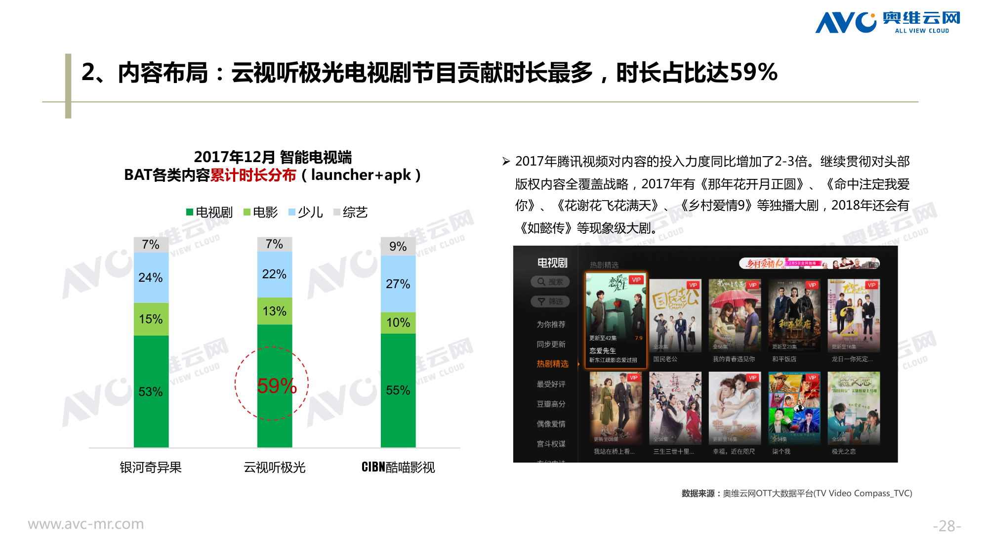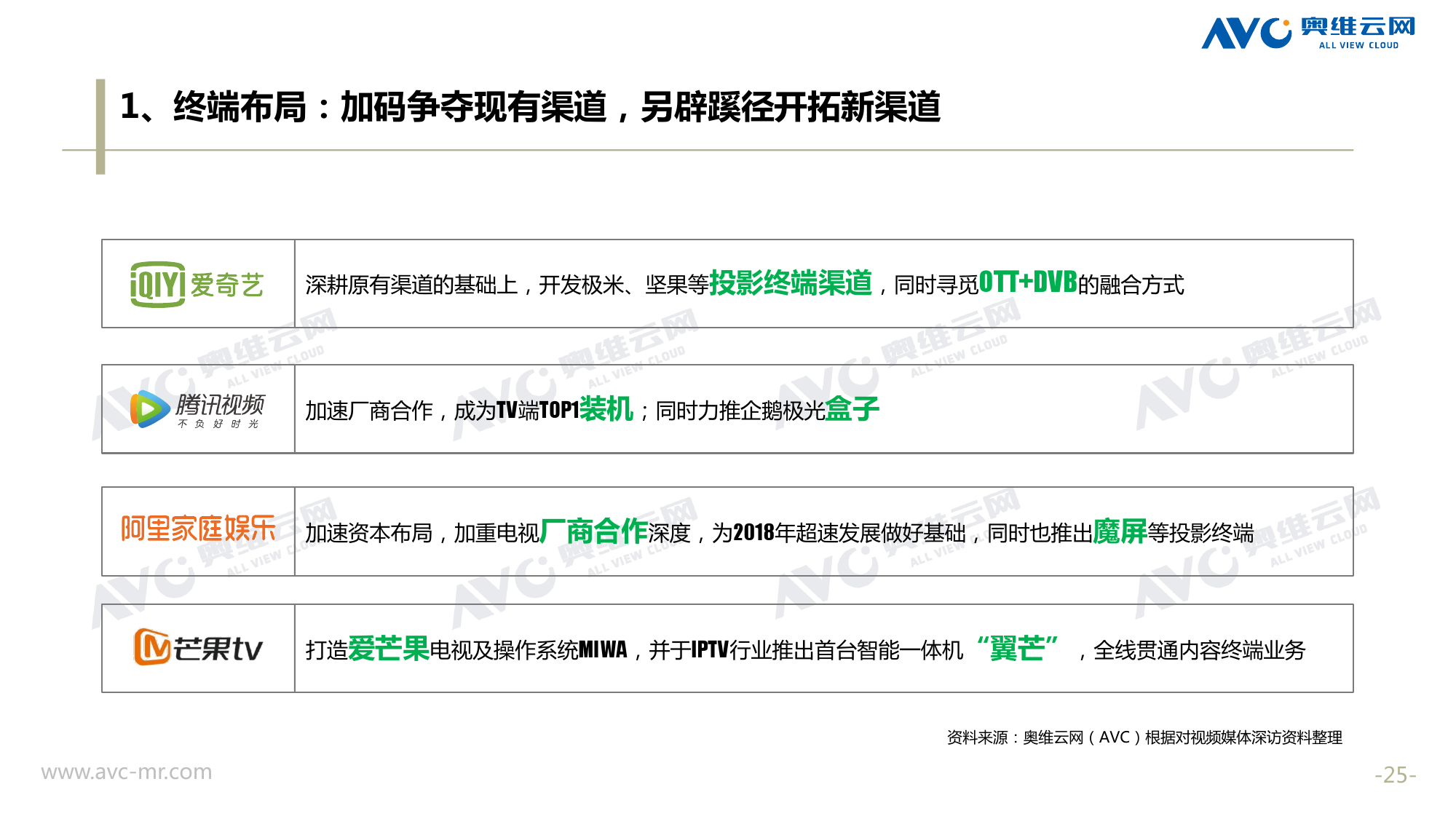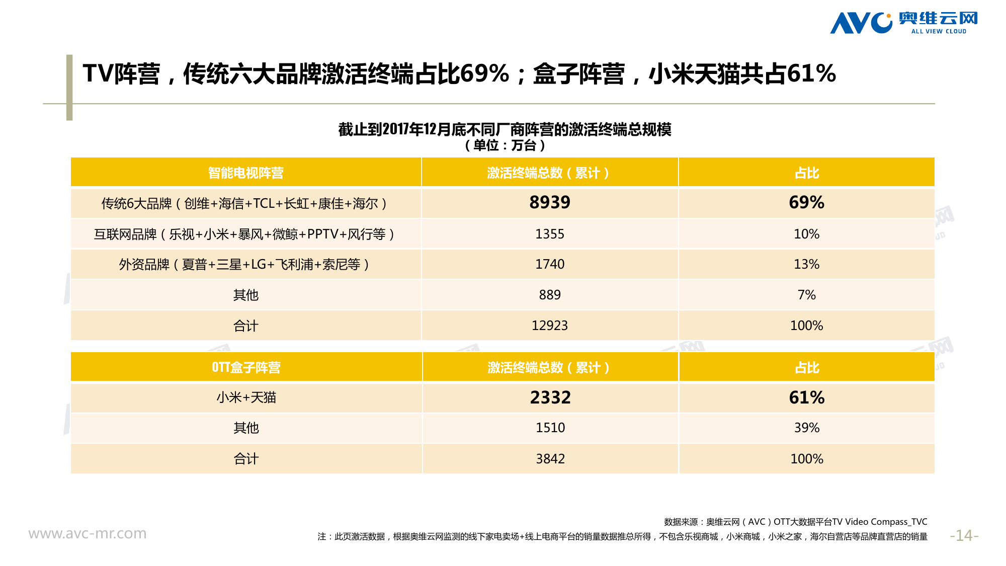 奥维云网:2018年中国OTT发展预测报告 《2018年中国OTT发展预测报告》,报告多维度分析了2017年OTT市场宏观发展环境分析、终端规模、 运营方向、广告投放趋势、资源价值变化,并对2018年的发展做出前瞻性预测。 PDF版本将分享到199IT交流群,199IT感谢您的支持! 更多阅读:奥维云网:2015年10月份中国OTT发展研究奥维云网:2016年第一周OTT盒子销量为14.9万台奥维云网:2015年11月中国OTT指数报告奥维云网 :2016年10月24日-10月30日OTT盒子观察报告奥维云网:2017年中OTT运营大数据蓝皮书奥维云网:2018年4月OTT大屏用户行为月报奥维云网:2017年度OTT全量数据排行榜奥维云网:2017年2月20日-26日OTT盒子观察报告奥维云网发布17年中OTT大数据蓝皮书: OTT用户月活终端8112万台同比增17.9%尼尔森:中国智能电视用户全样本收视行为及OTT广告价值研究奥维云网:2016年2月22日-2月28日OTT盒子观察报告奥维云网:2019年8月中国彩电市场简析奥维云网:2015年4月-9月线上智能电视盒大数据奥维云网:2016上半年中国OTT盒子市场分析及预测奥维云网:2019年Q1中国洗衣机市场总结报告