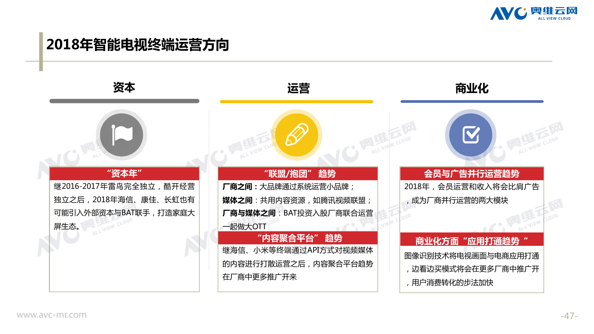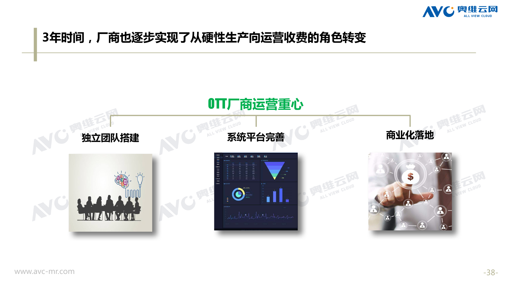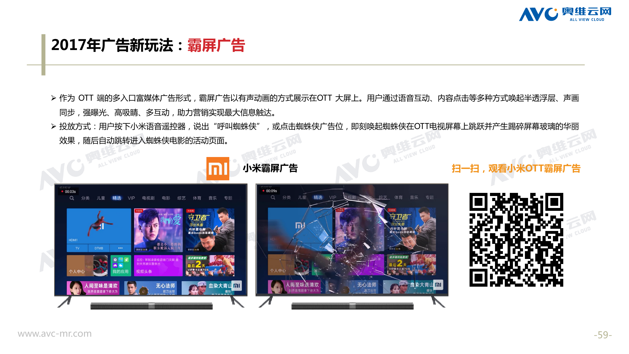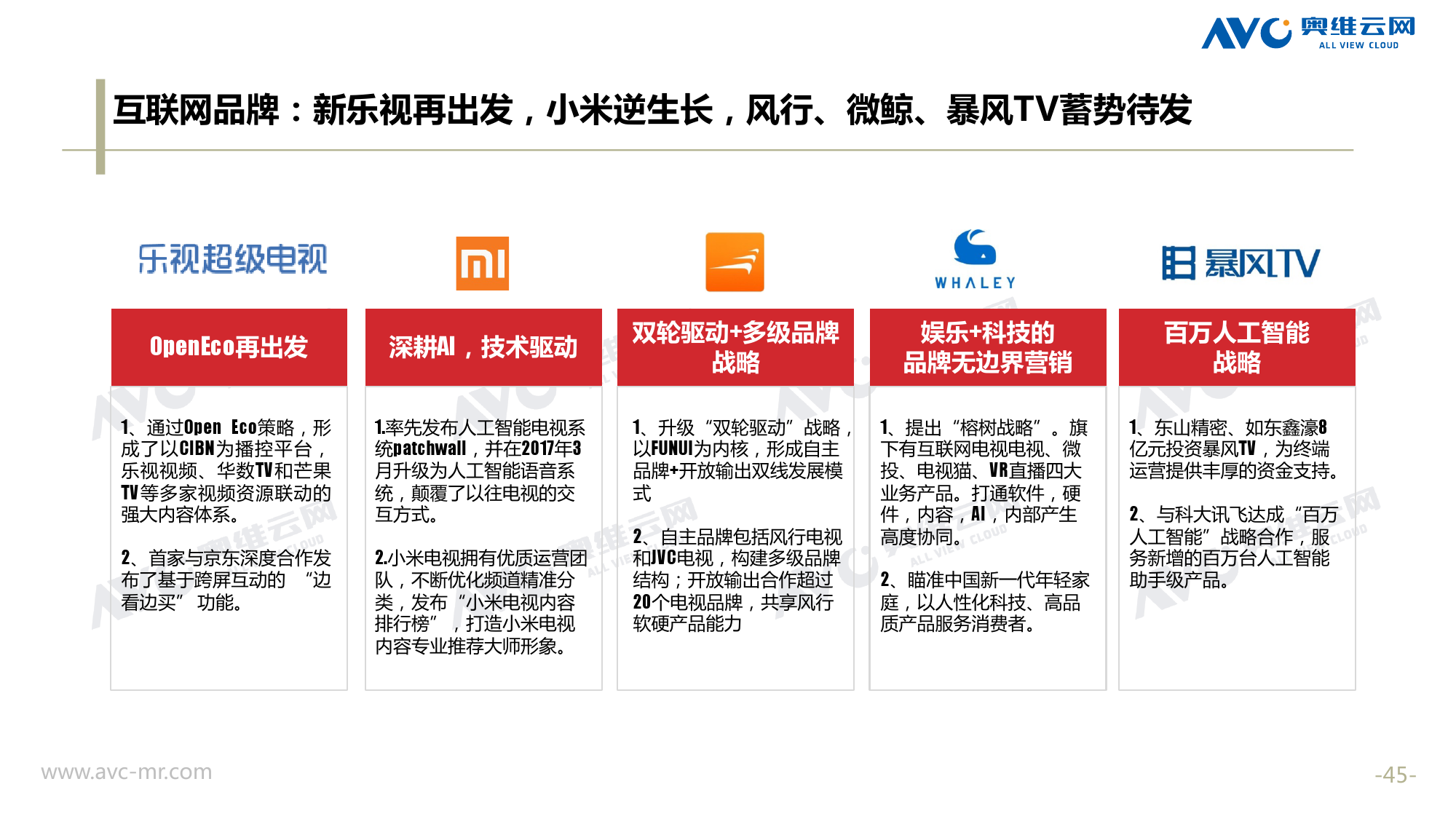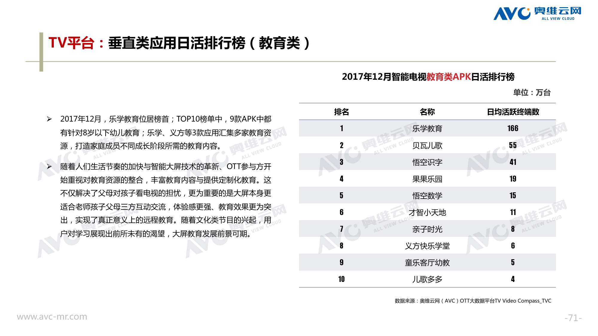 奥维云网:2018年中国OTT发展预测报告 《2018年中国OTT发展预测报告》,报告多维度分析了2017年OTT市场宏观发展环境分析、终端规模、 运营方向、广告投放趋势、资源价值变化,并对2018年的发展做出前瞻性预测。 PDF版本将分享到199IT交流群,199IT感谢您的支持! 更多阅读:奥维云网:2015年10月份中国OTT发展研究奥维云网:2016年第一周OTT盒子销量为14.9万台奥维云网:2015年11月中国OTT指数报告奥维云网 :2016年10月24日-10月30日OTT盒子观察报告奥维云网:2017年中OTT运营大数据蓝皮书奥维云网:2018年4月OTT大屏用户行为月报奥维云网:2017年度OTT全量数据排行榜奥维云网:2017年2月20日-26日OTT盒子观察报告奥维云网发布17年中OTT大数据蓝皮书: OTT用户月活终端8112万台同比增17.9%尼尔森:中国智能电视用户全样本收视行为及OTT广告价值研究奥维云网:2016年2月22日-2月28日OTT盒子观察报告奥维云网:2019年8月中国彩电市场简析奥维云网:2015年4月-9月线上智能电视盒大数据奥维云网:2016上半年中国OTT盒子市场分析及预测奥维云网:2019年Q1中国洗衣机市场总结报告
