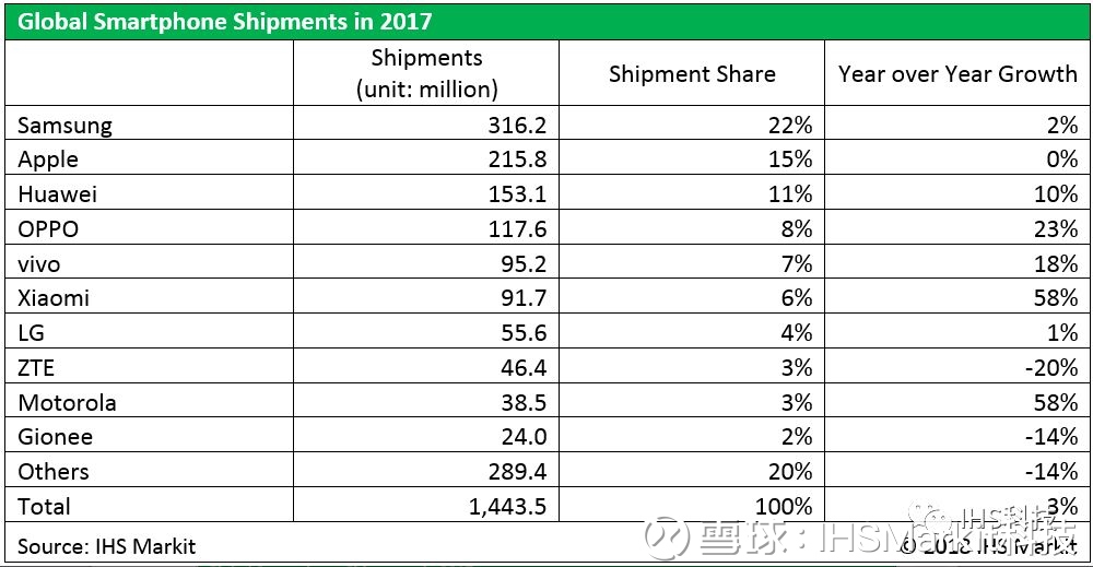据市场研究公司IHS Markit初步统计数据显示,2017年第四季度全球智能机出货量同比下降4.5%至3.875亿部,全年出货量同比增长3.1%至14.4亿部。在领先的智能机品牌中,只有小米公司和联想的摩托罗拉品牌在第四季度实现了出货量的增长。