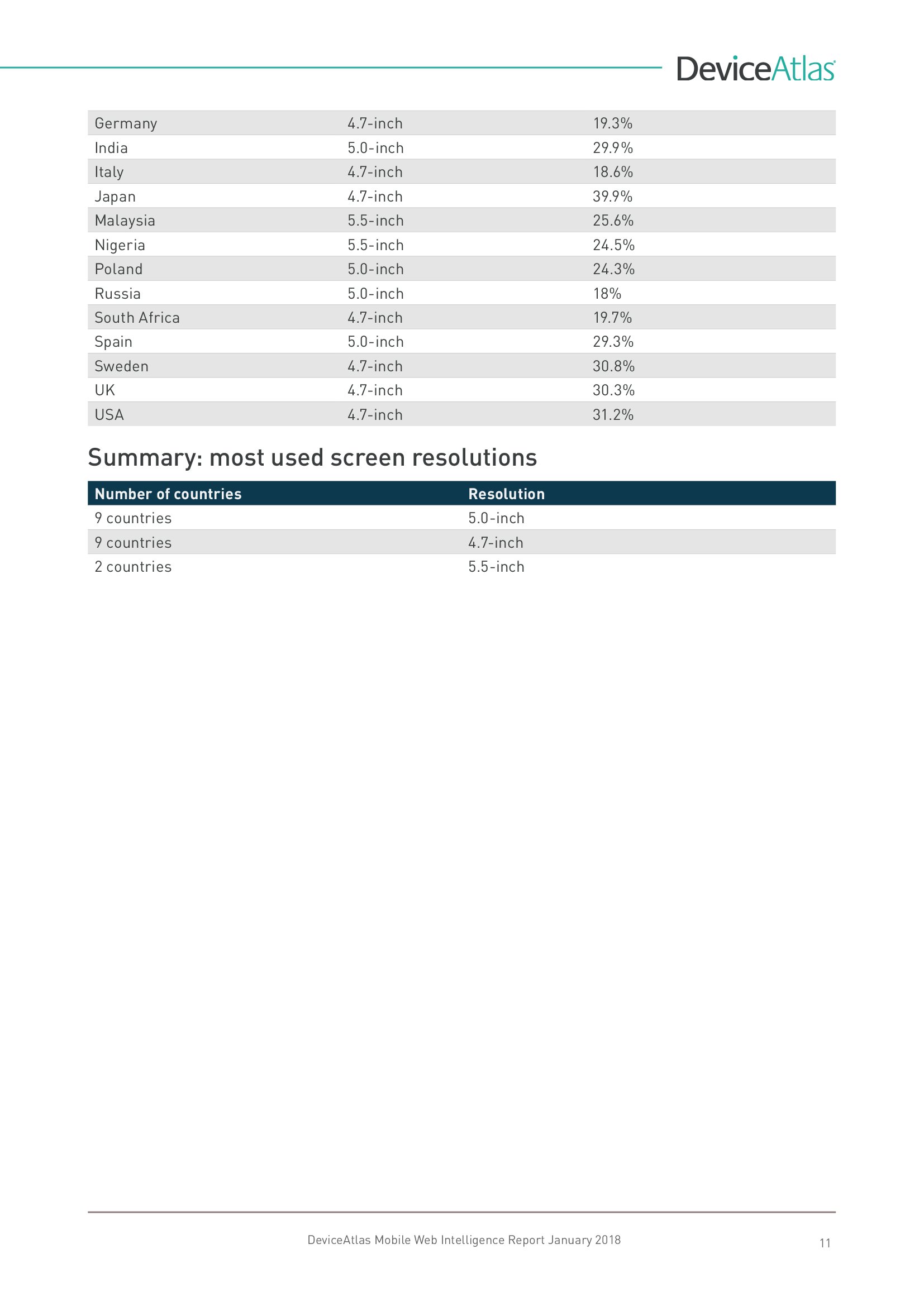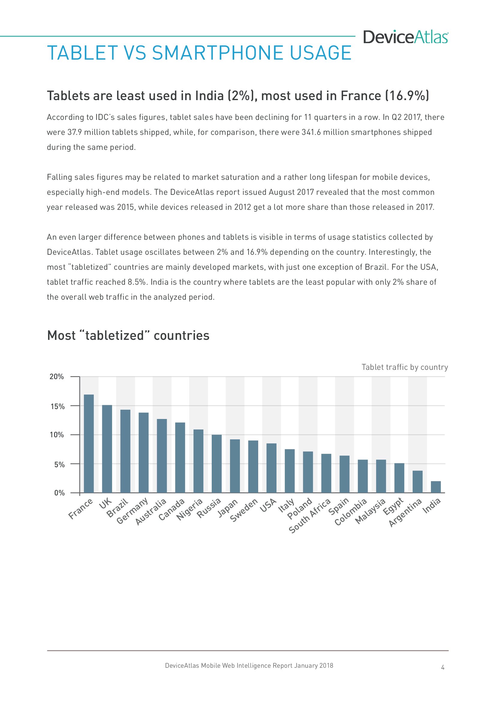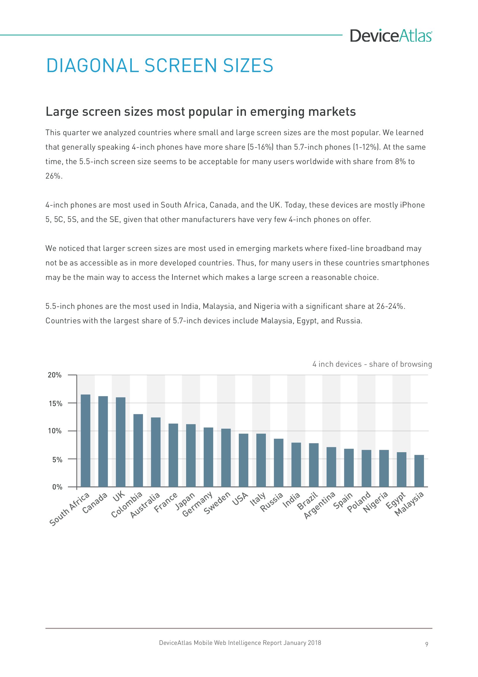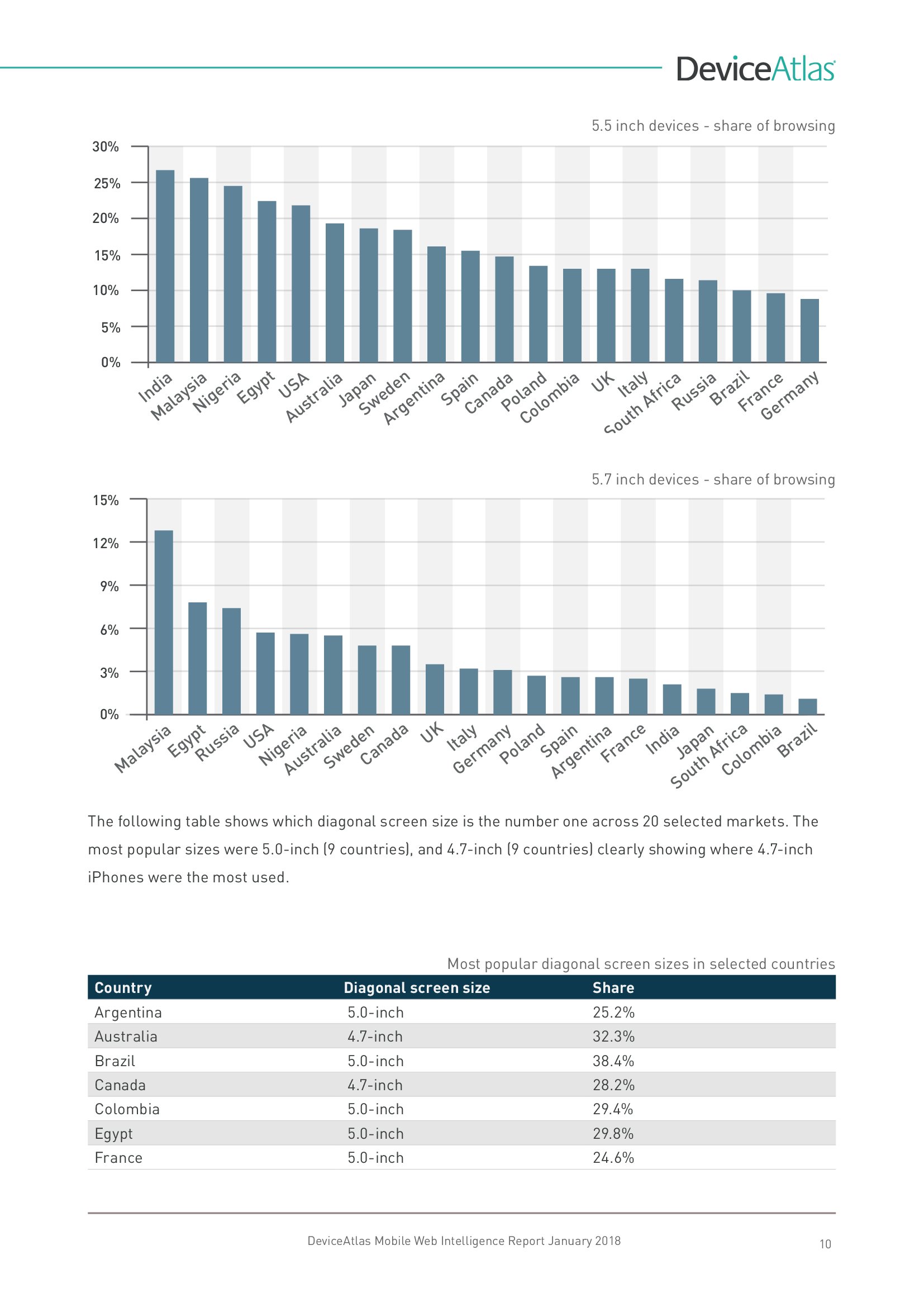 DeviceAtlas发布了新报告“移动网络情报”,调查了全球20个国家平板和智能手机使用量、屏幕尺寸、顶级制造商、设备内存、LTE、NFC等。