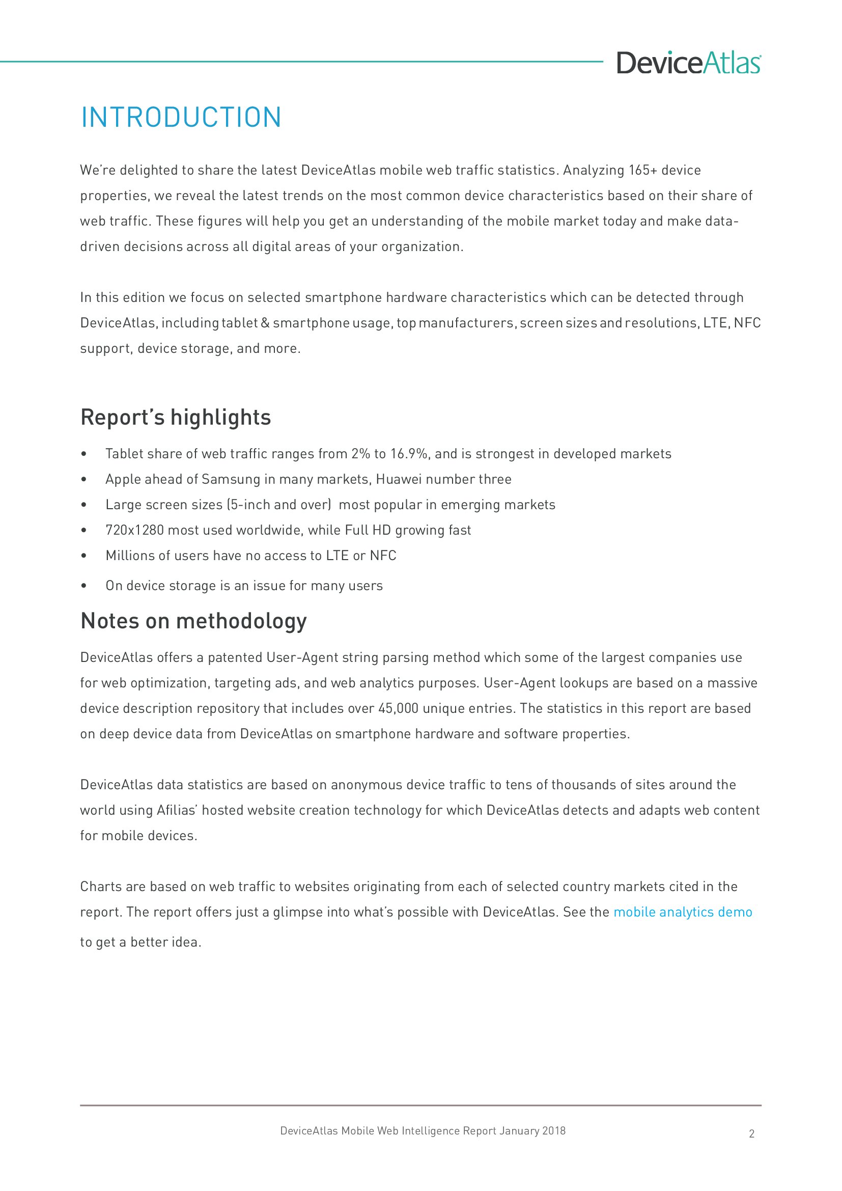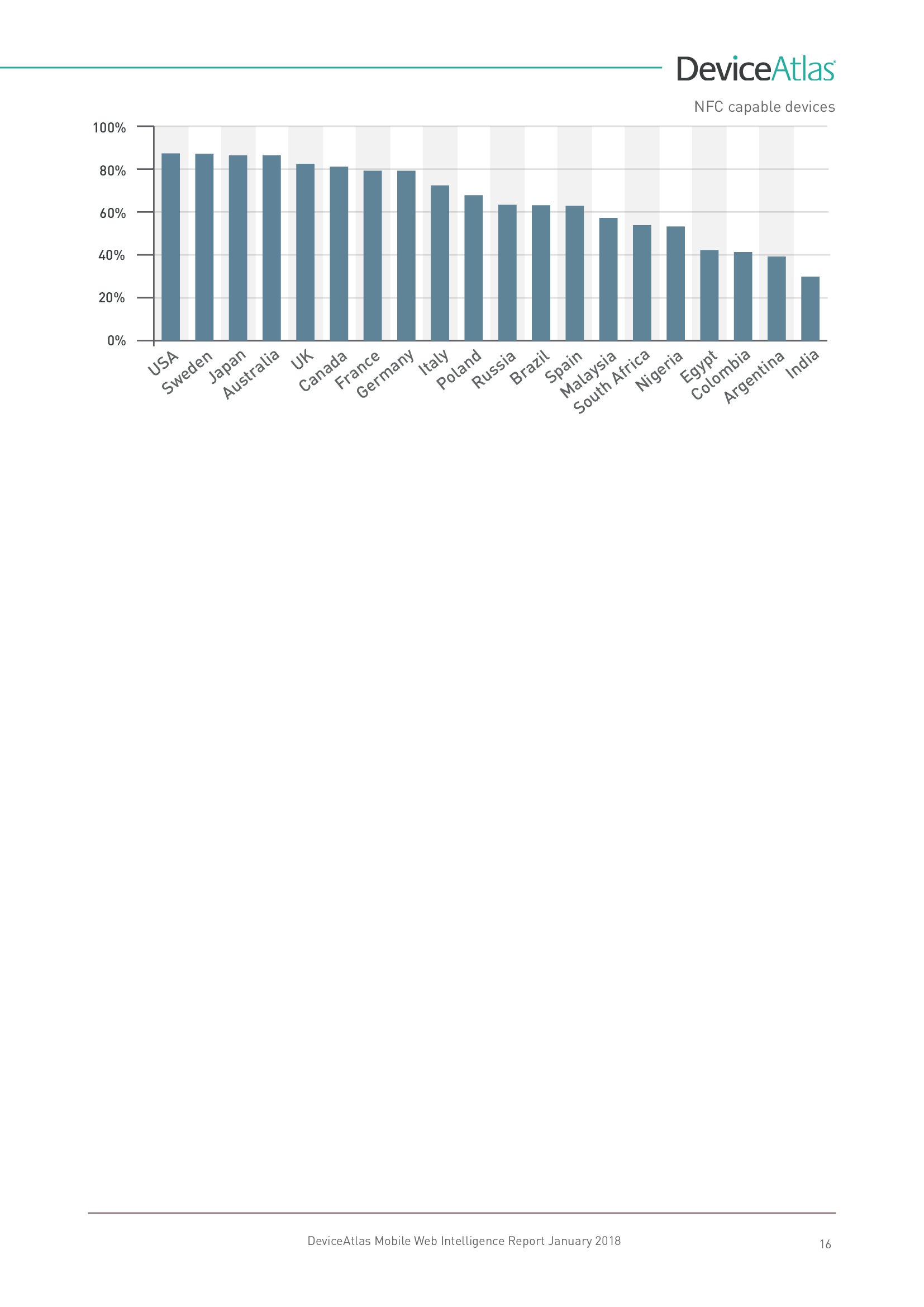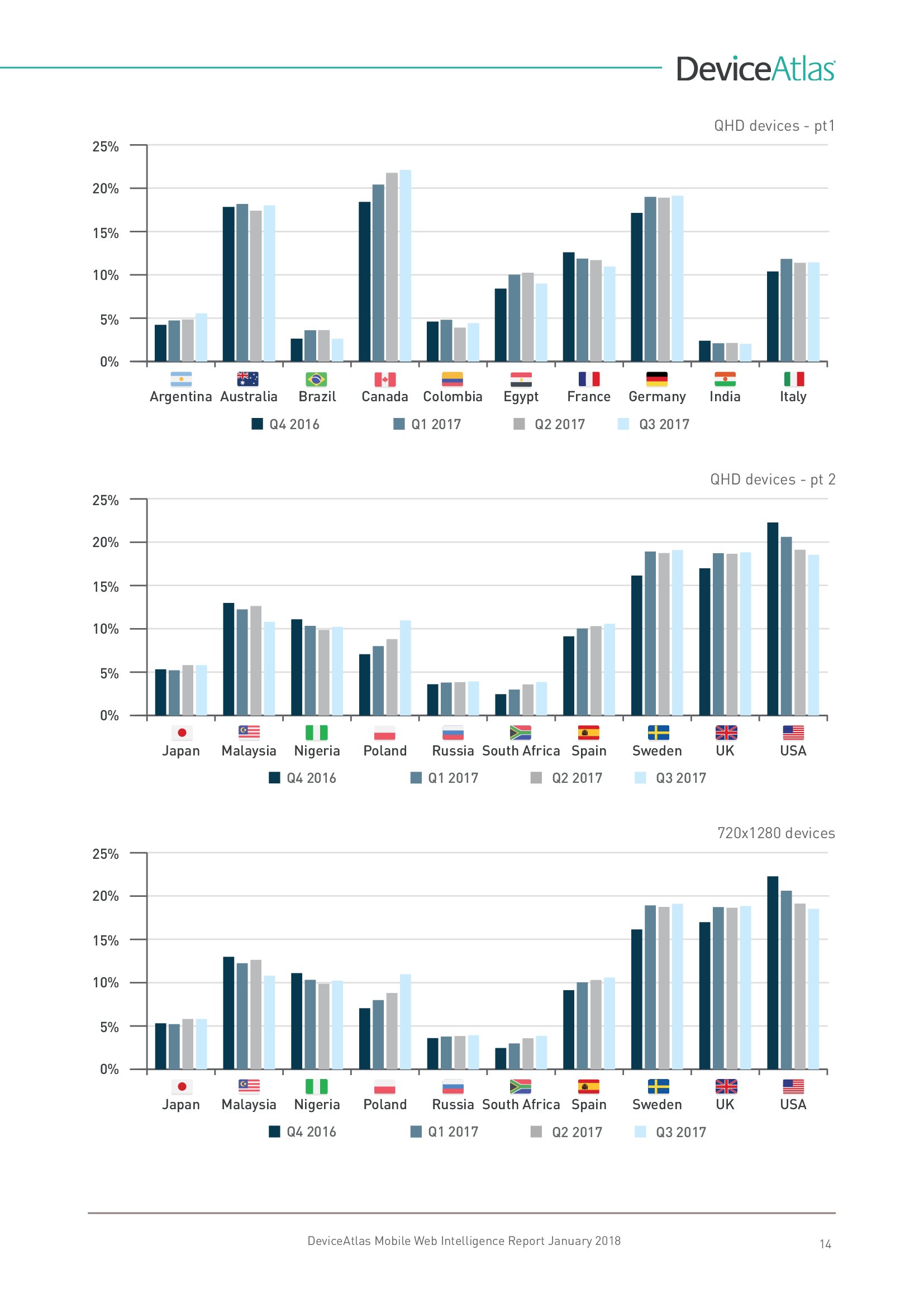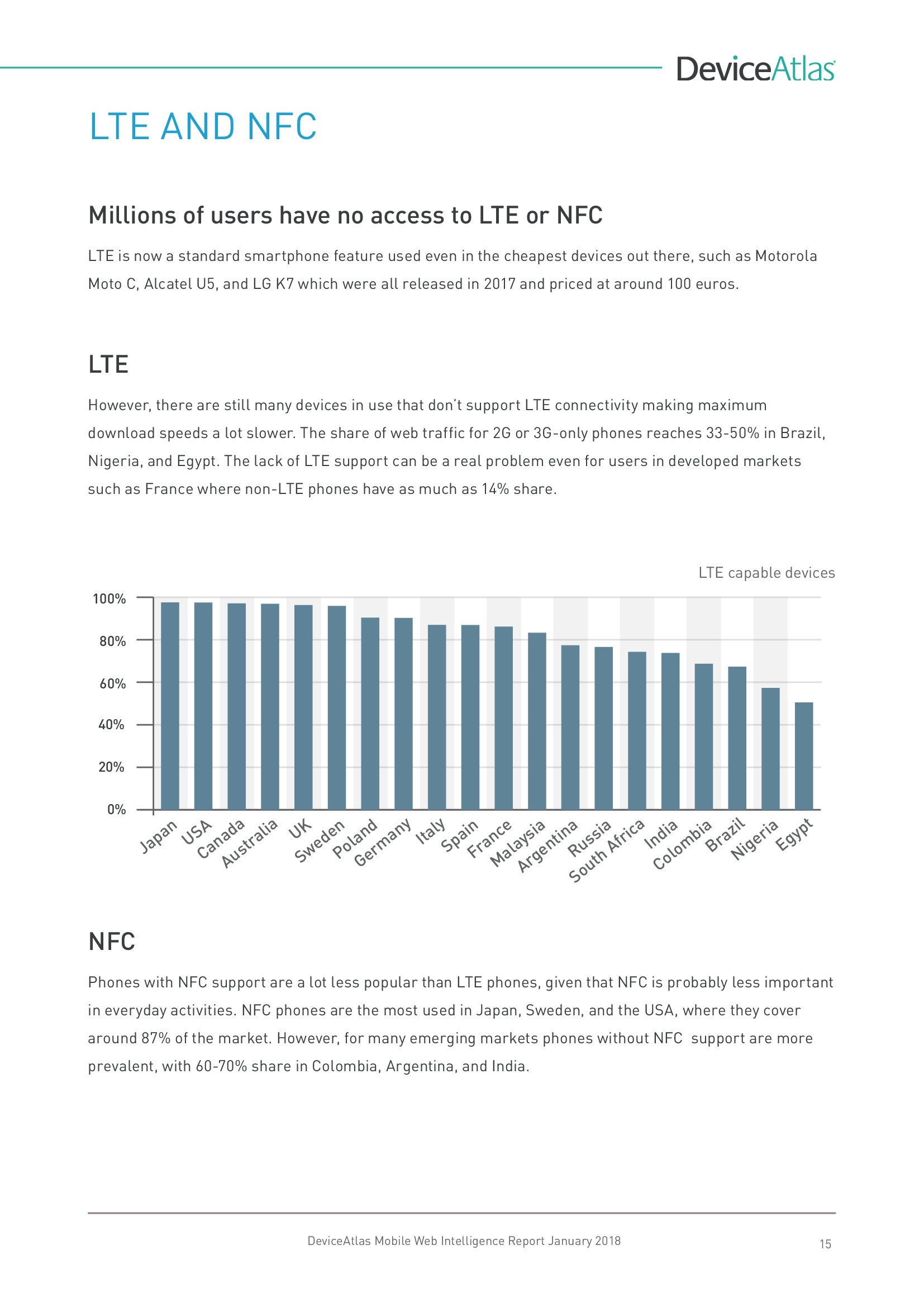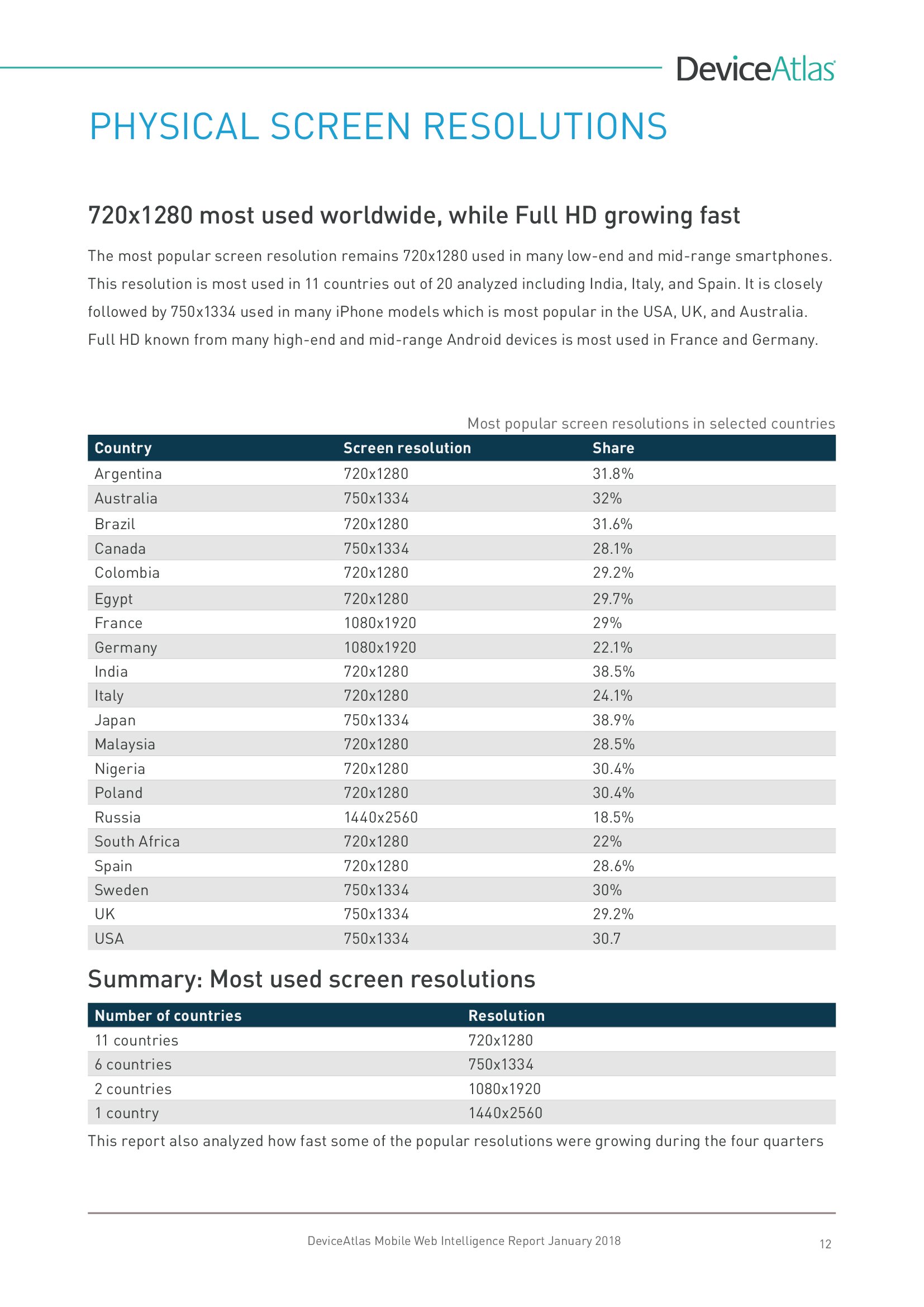 DeviceAtlas发布了新报告“移动网络情报”,调查了全球20个国家平板和智能手机使用量、屏幕尺寸、顶级制造商、设备内存、LTE、NFC等。