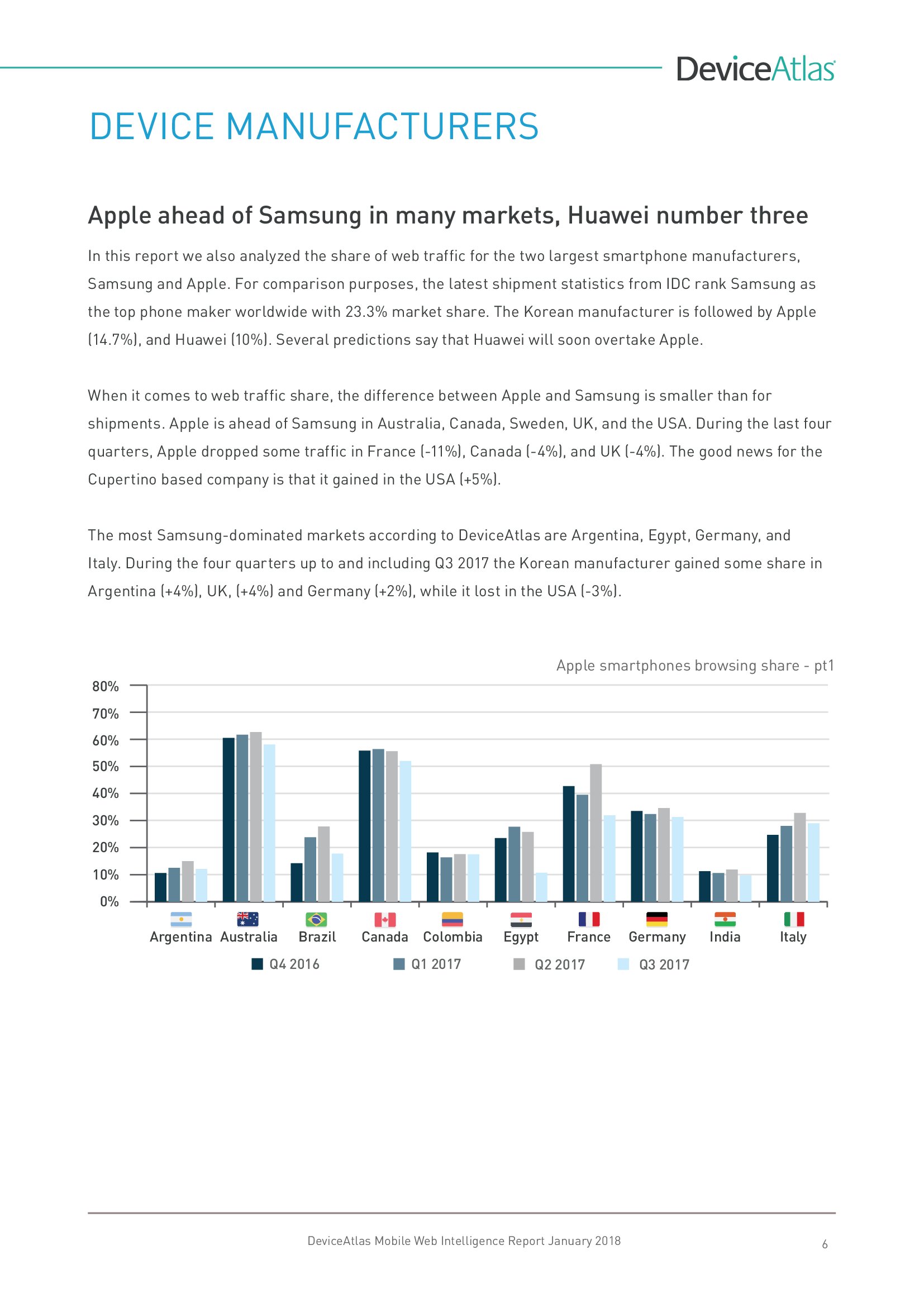 从设备制造商来看,苹果在很多市场仍然领先于三星,华为排在第三位。从出货量来看,三星占23.3%,其次是苹果(14.7%)和华为(10%),但是从网络流量来看,苹果和三星的差距小于出货量。苹果在澳大利亚、加拿大、瑞典和美国领先于三星,但是过去四个季度苹果在法国(-11%)、加拿大(-4%)和英国(-4%)的流量有所下降,在美国的流量则增长了5%。而三星则主宰阿根廷、埃及、德国和意大利市场。