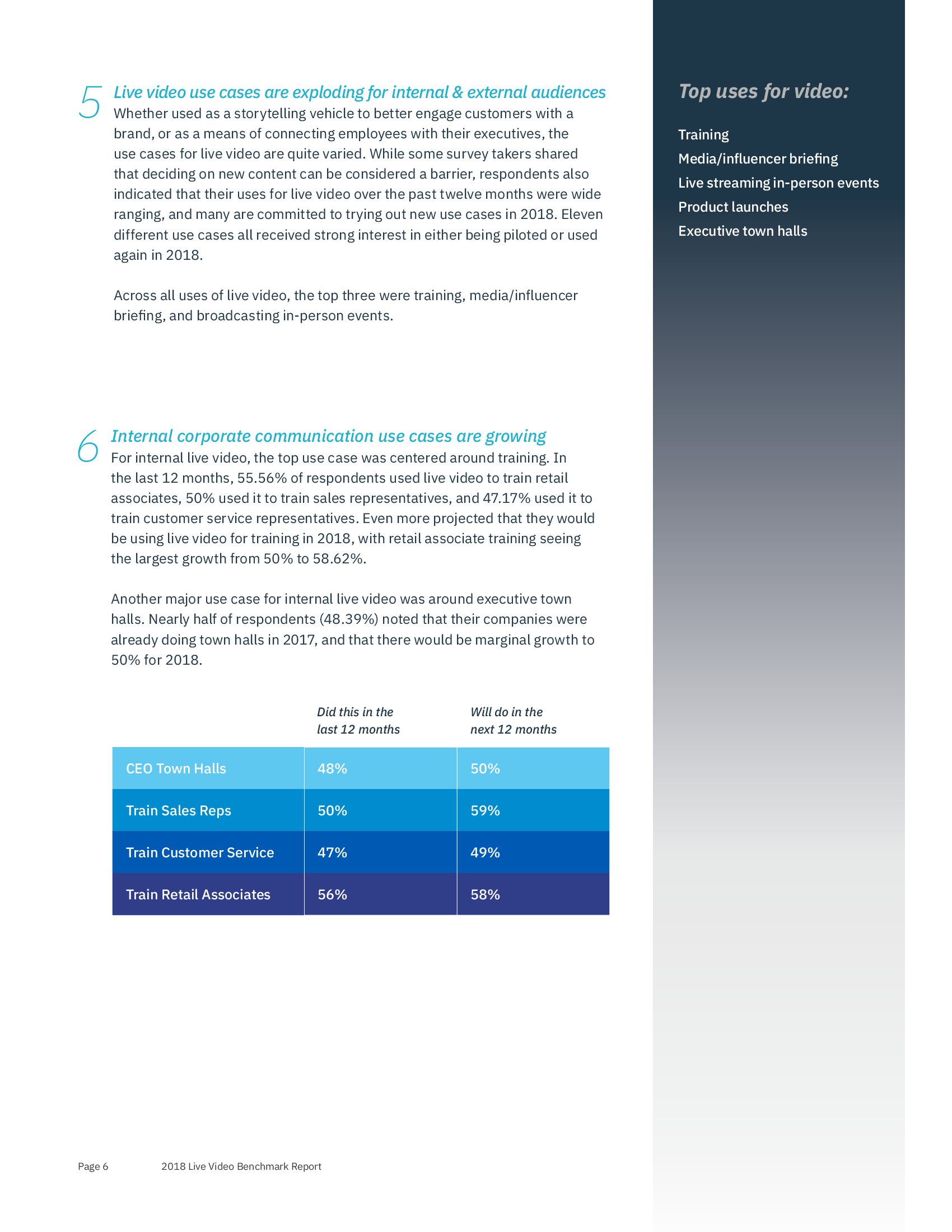 企业内部使用实时流媒体视频进行通讯也越来越受关注。大部分受访者表示将在明年使用直播视频培训销售代表(59%)和零售代表(585),还有一半受访者计划CEO Town Hall(是一种非正式的集会,企业内部接触和交流意见的形式之一)。
