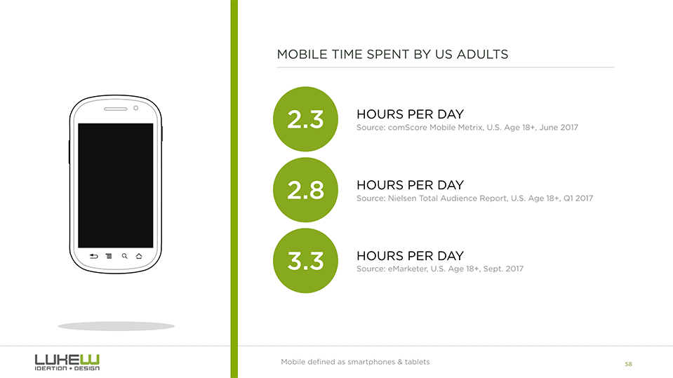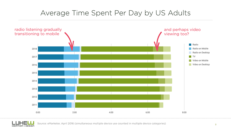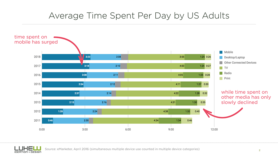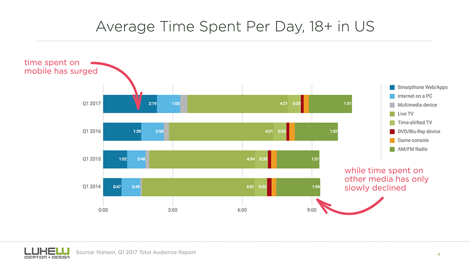 Lukew:移动设备带动美国多屏幕时间增长 199IT原创编译 Lukew研究了美国成年人花在各种设备屏幕前的时间是如何变化的。 虽然人们在移动设备上花费的时间显著增长,但大多时候是和其他设备叠加的。也就是说,移动设备在美国带动了多屏幕时间的增长。 尼尔森过去四年的受众调查报告也显示了相同的趋势。 像收听广播和观看视频这样的活动确实逐渐像移动设备转移,主要是智能手机。 美国人每天花3个小时使用移动设备,因此这样的趋势也不足为奇。 199IT.com原创编译自:Lukew 非授权请勿转载 更多阅读:AdAge: 欢迎使用新的第一屏幕——你的手机ONS:移动设备使用量增长影响人们面对面交流Opera:移动设备已经成为旅游搜索和预定的主要设备eMarketer:43.4%的中国移动设备用户在传统休息时间上网Deloitte:2015年数字设备影响的店内零售销售额约占64%eMarketer:在网上收看里约奥运会的观众数量比伦敦奥运会增长150%eMarketer:移动设备推动Facebook使用量增长当被“多屏幕”绑架,企业传播如何有效“跨屏”?YouGov:研究显示多屏幕为广告商带来机会eMarketer:在英国,多屏幕活动分散看电视的时间Common Sense:47%的美国家长认为孩子对移动设备“上瘾”Ericsson:2018年6月移动报告Common Sense:2017年0-8岁儿童媒体使用情况报告Blancco:2018年Q1移动设备维修和安全状况报告eMarketer:今年中国成年人花在移动设备上的时间首次超过电视