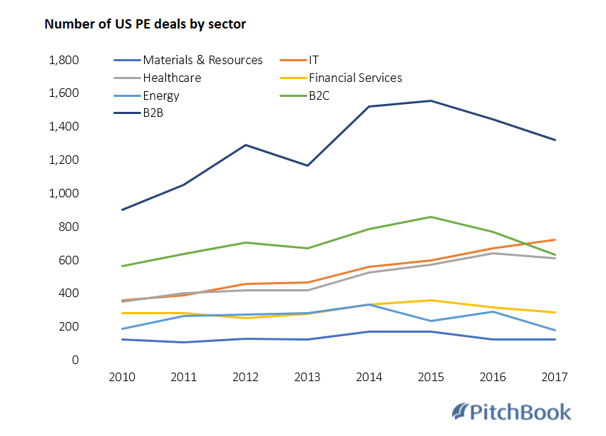 IT,特别是软件,是唯一一个没有受到PE“地震”影响的行业。2017年美国PE数据显示,除了这个行业之外,其他行业的数字都在下降。
