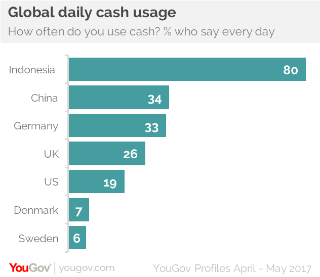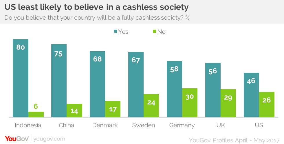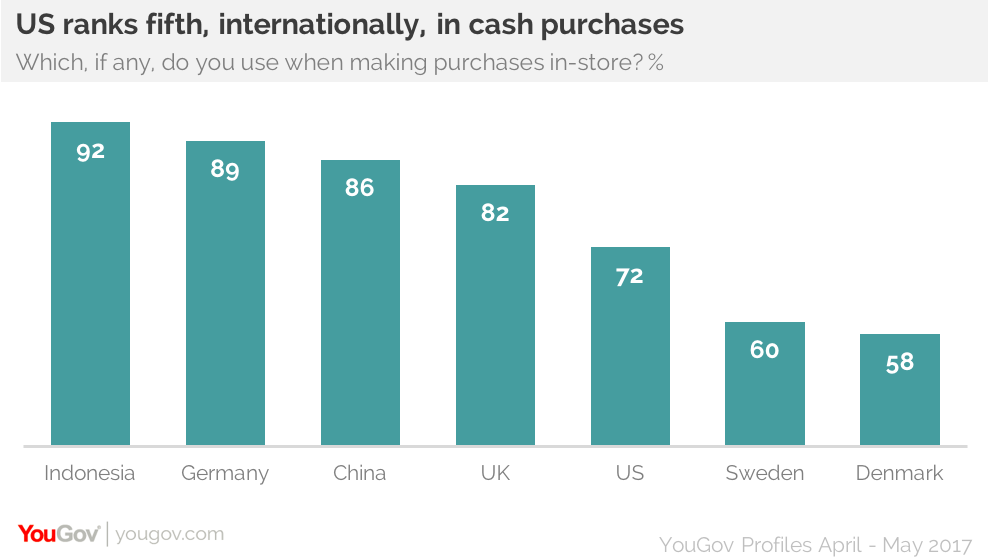 随着更便捷的支付方式在全球各国快速普及,每个人都在思考一个问题,未来现金将扮演什么角色? YouGov对美国、英国、中国、印度尼西亚、丹麦、瑞典和德国消费者日常店内支付的调查显示,尽管一些消费者使用移动支付,但是美国人对无现金社会仍持怀疑态度,而且更喜欢信用卡和借记卡。