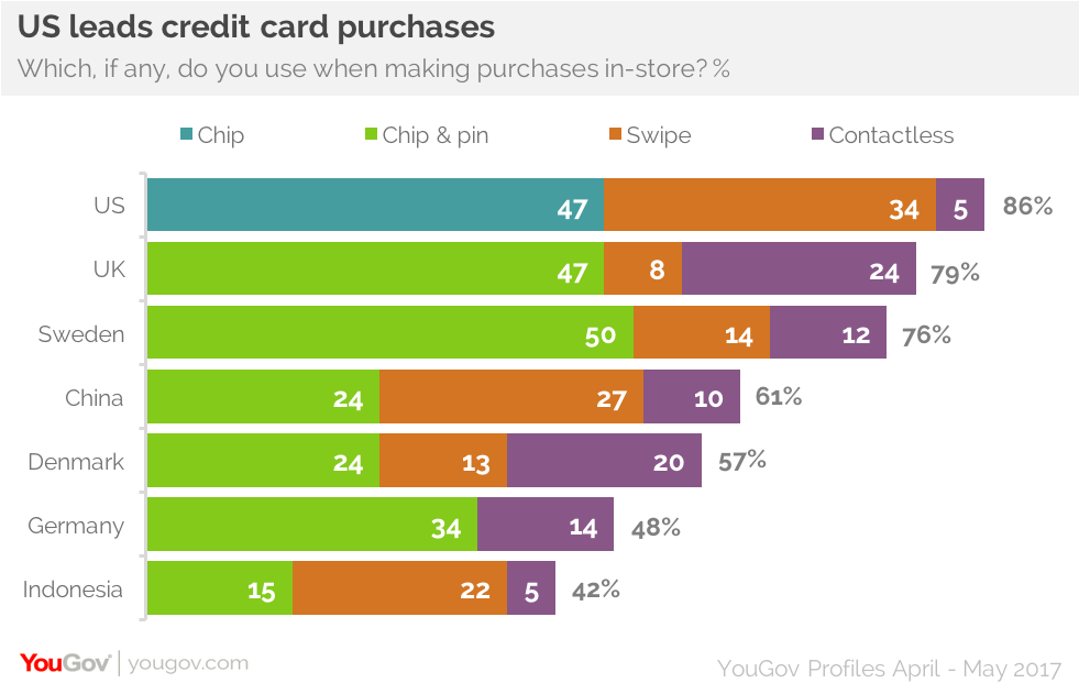 银行卡是这个时代的新王者,而YouGov的数据证实了这一点,近9/10的美国人(86%)使用信用卡支付账单。在美国,最受欢迎的信用卡支付方式是芯片(47%),其次是刷卡(34%),少数使用非接触式卡(5%)。和美国人一样喜欢使用信用卡的还有英国(79%)和瑞典(76%)。