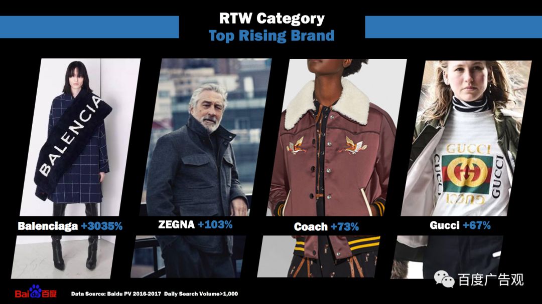 在所有的检索量中,只有13%围绕在品牌相关词,这也是因为大家在挑选服饰或者鞋子时更多的会去关注款式、颜色,是否流行等等,对于品牌的诉求和忠诚度不太高,但是品牌相关词的检索增幅达16%,高于整体行业均值,消费者正在追求从头到脚的品质感,可见中国奢侈品成衣品类的潜力巨大。