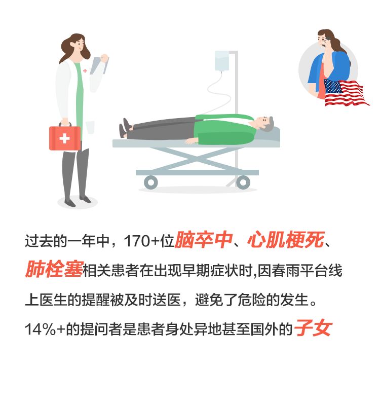 数据还显示,2017年,春雨医生平台的医生,通过用户提供的症状描述或者是相关的检查结果,对一百多例脑卒中、心肌梗塞和肺栓塞相关患者进行了危机预警,提醒用户及时送医而避免了危险的发生。值得注意的是,这类问题的提问者,不少是不在父母身边甚至远在海外的子女。