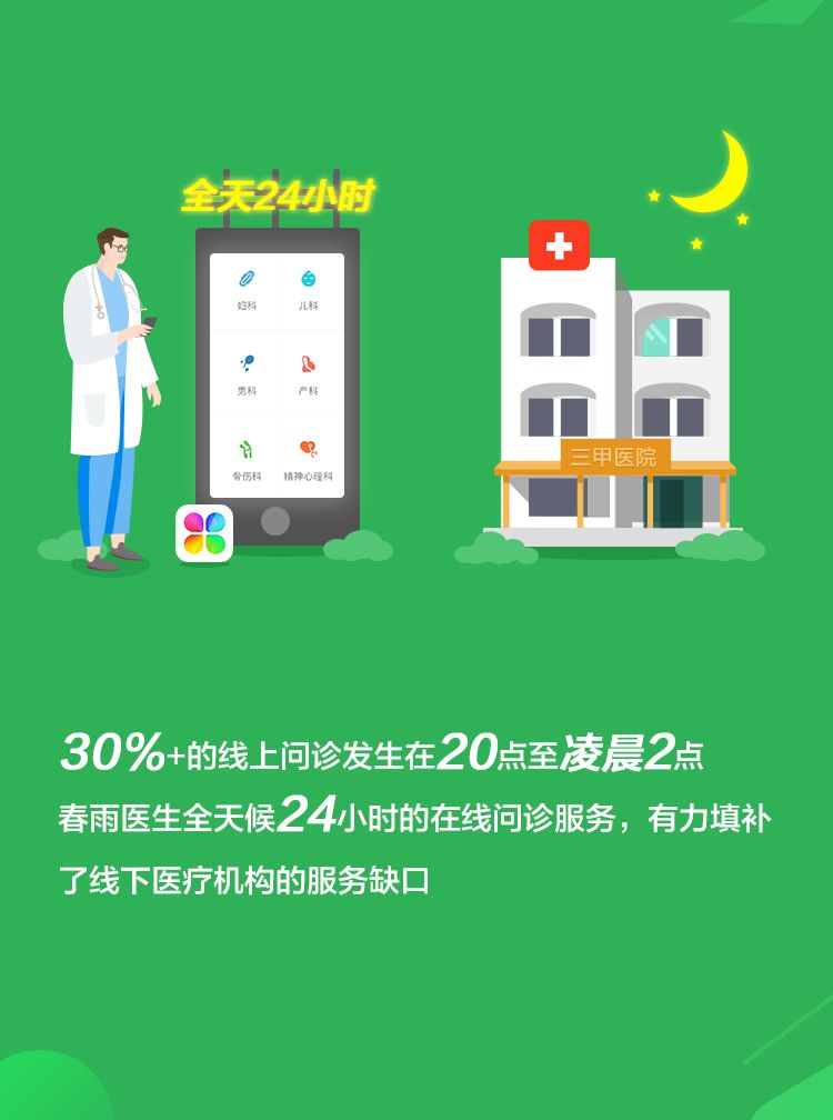 在全部交互中,超过三成的线上问诊发生在20点至凌晨2点,春雨医生全天候24小时的在线问诊服务,有力填补了线下医疗机构的服务缺口。