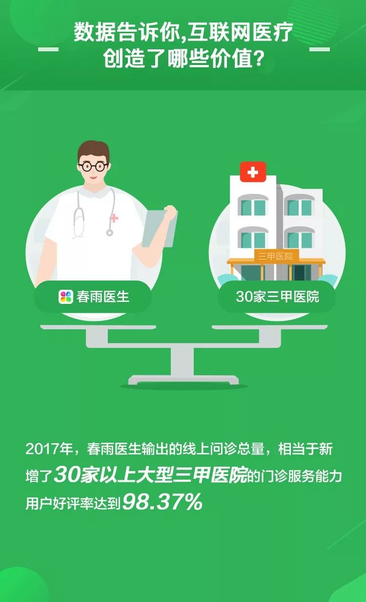 《报告》显示,2017年,春雨医生输出的线上问诊总量,相当于新增了30家以上大型三甲医院的门诊服务能力,患者好评率达98.37%。