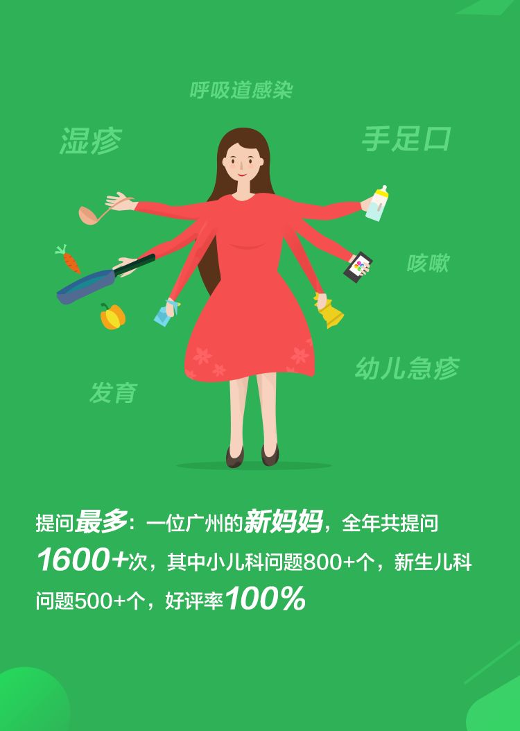 2017年,一位来自广州的新手妈妈,成为在春雨医生平台上提问最多的用户,全年共提问超过1600次,其中小儿科问题800余个,新生儿科问题500余个。春雨医生成为了她的“育儿宝典”,而这位十分在意宝宝健康的新手妈妈,也为回复了她问题的医生们打出了百分百好评。