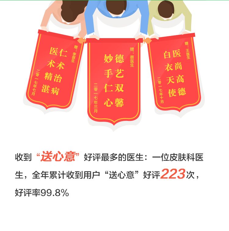 在春雨医生平台开设的“送心意”评价环节,一位皮肤科医生全年累计收到用户“送心意”好评223次,好评率99.8%。随意翻开医生的问诊页面,经常可见患者“专业”“负责”“耐心”的好评描述,更有感激的患者写道“有时候患者带着最后一丝希望求助于此的时候,很感谢,天使洒落了一束光芒”。