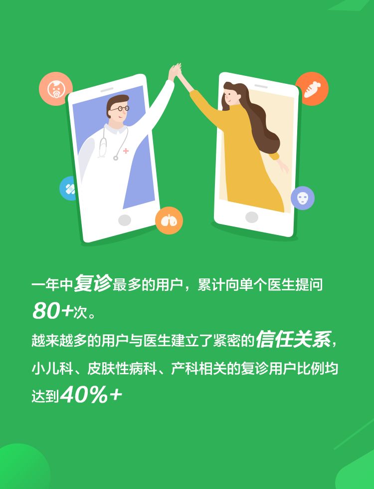 在儿科、皮肤科和产科等科室,用户对平台和医生的信任度、用户自身的依从性都非常高,在单一科室提问次数超过10次的用户,已经超过总数的40%。通过线上服务的持续使用和反馈,这些科室和病种的用户,已经养成了在线的健康管理习惯。