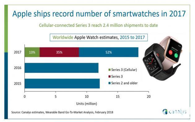 近日,根据市场研究机构Canalys发布的最新数据报告,Apple Watch在2017年的销量达到了1800万部,比2016年增加了54%;其中,在2017年第四季度,Apple Watch的销量为800万部,比2016年同期增加了32%。