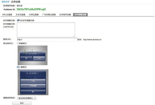 针对iOS开发者——提供了“好评提醒”的功能,目前提供两键模式和三键模式两种提醒样式,并且提供了4种提醒频率。