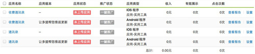 domob提供了非常直观并且可以便捷操作的dashboard,具体的可以看上图的曲线指向。另外一点比较好的是在应用的列表页将最主要的数据展示出来,方便用户的浏览。
