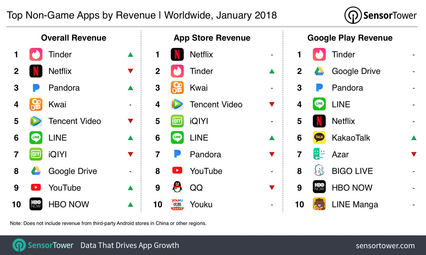 根据Sensor Tower商店情报Store Intelligence平台最新排名数据,Tinder是今年1月期间全球App Store加入Google Play收入最高的非手游类APP。移动消费者在这款热门交友APP中一共花销了6800万美元.Tinder在同时代替了2017年全年的收入冠军Netflix,获得今年1月份的首位。