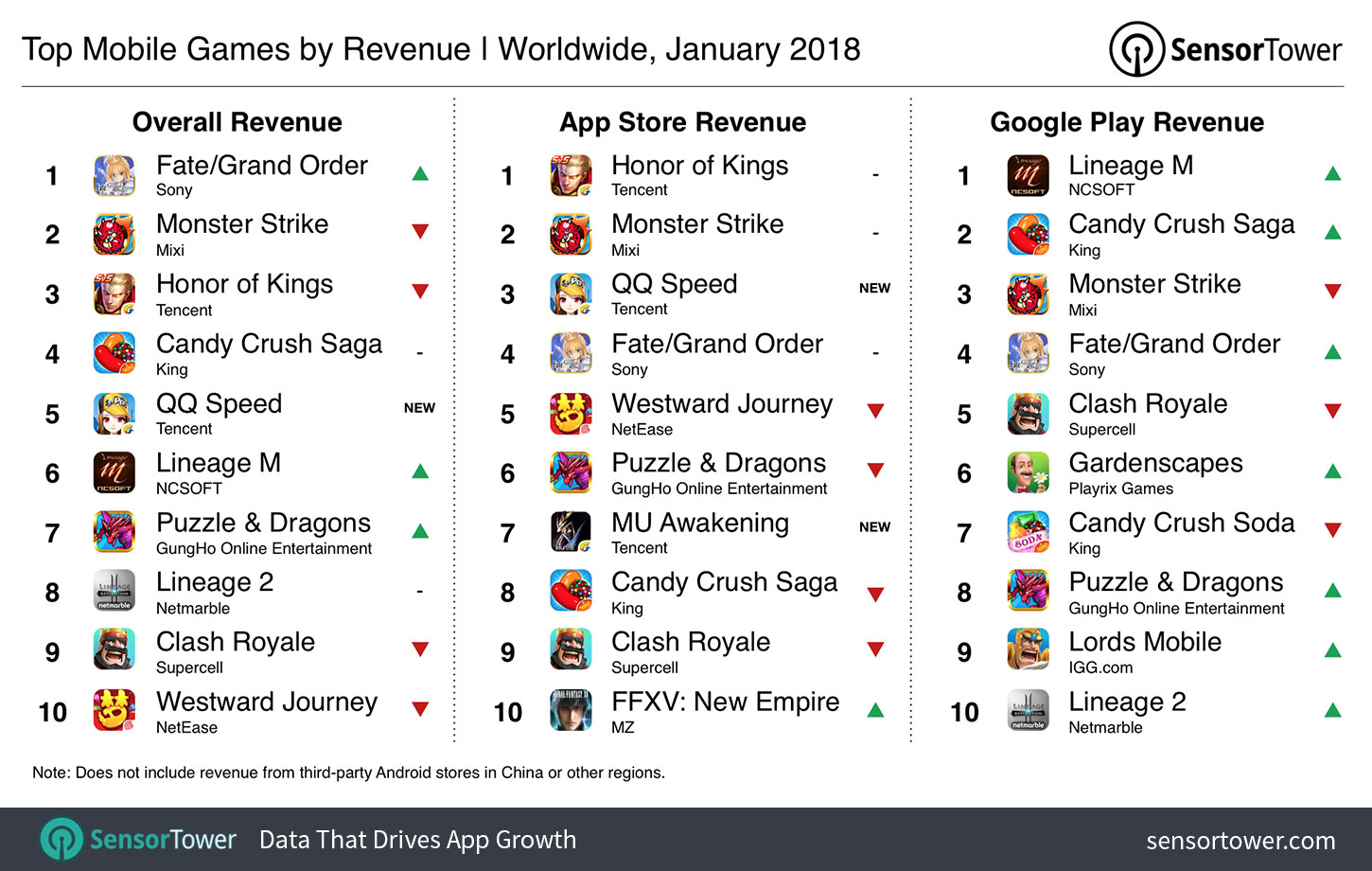索尼旗下手游巨作“Fate / Grand Order”是两大商店综合收入最高的手游APP,超越了Mixi的“怪物弹珠”及腾讯之“王者荣耀”。然而,腾讯在去年底上线的新作“QQ飞车”首月成绩尤其突出,打入全球综合收入前五强。