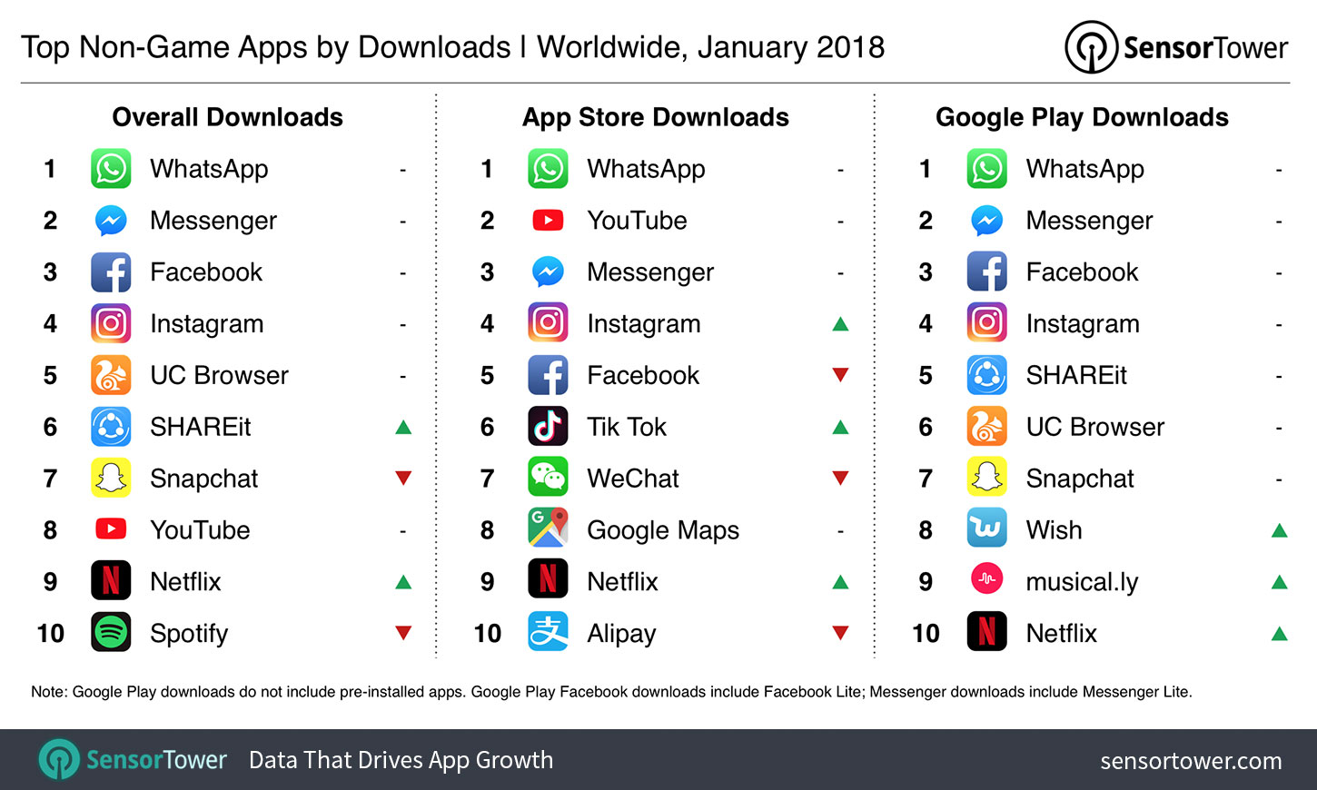 Facebook旗下社交应用WhatsApp是全球综合,iOS和Google Play下载量都最大的非手游类APP。进一步观察,三大榜单的前五强中,有四部都是Facebook公司所拥有的社交应用,包括Messenger,Instagram,以及Facebook应用本身。