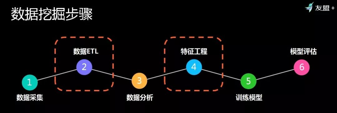 数据处理之后,是数据挖掘。数据挖掘一般分为6个步骤:数据挖掘、数据ETL,第三个是对数据进行分析,然后提取出特征工程,从而进行模拟训练,然后再进行模型评估。