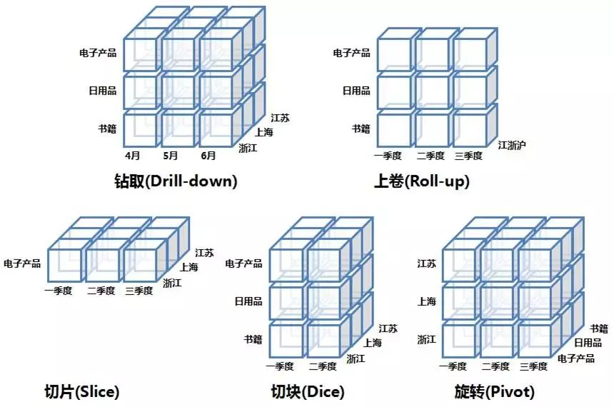 数据立方体的钻取。就是对某一个维度进行下钻,对月份进行下钻,就是对维度进行细分。我们来看一个季度的分布,上卷就看到一、二、三季度的分布。我们锁定了品类的维度叫电子产品,去看季度、地区的情况,这叫切片。切块很简单,多个维度就变成了切块。以季度和地区去看品类的情况,做立体三维空间的反转,就是数据立方体。