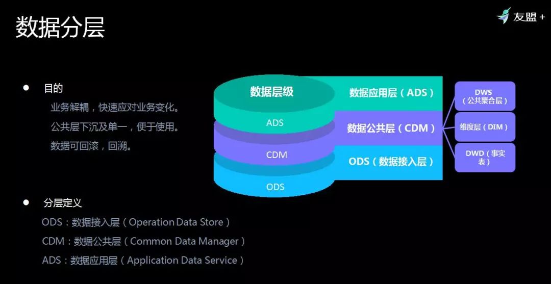 有很多数据需要做数据分层,比方说今天重新建了一张表,这个业务发生变化了。现在互联网的状态就是拥抱变化,每周都会不停的在开发新表,如何用2分钟就把这个表变了。分层业界里面都会分为三层:数据接入层ODS、数据公共层CDM、数据应用层ADS。我们针对明细数据做分析,比如说广州市是广东省的这样一个对应关系。公共聚合层就是数据立方体,数据应用层就是针对不同的业务去划分独特的一块区域,通过分层可以做到业务解耦。