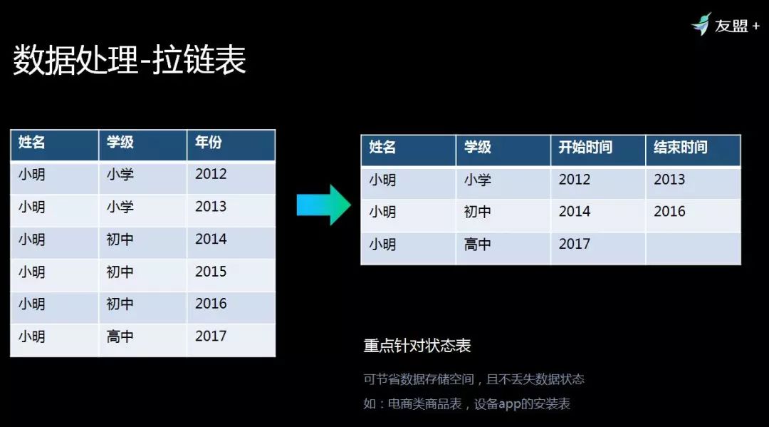 数据加工中的一个拉链表,左边这张表记录了小明每年的学籍,小明在2012-2013年之间都是小学,我们记录开始时间和结束时间。左边这个数据到右边这个数据很频繁,只记录状态的变化就可以了。这个场景可能会应用于哪些行业呢?比如电商系统,这个商品今天做促销,明天促销就取消了,对商品价格打一个快照。