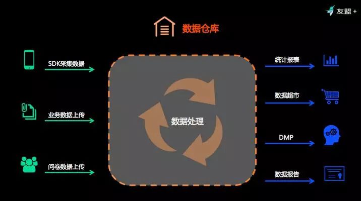 我们先看一下数据仓库,左边是输入数据,第一是数据采集,直接通过JS代码或者SDK采集设备行为数据;第二是业务数据上传;第三是营销领域的问卷数据上传、文件数据上传等。右边是输出数据。数据经过处理后主要以四种形式输出,包括统计报表、数据超市、DMP、数据报告。