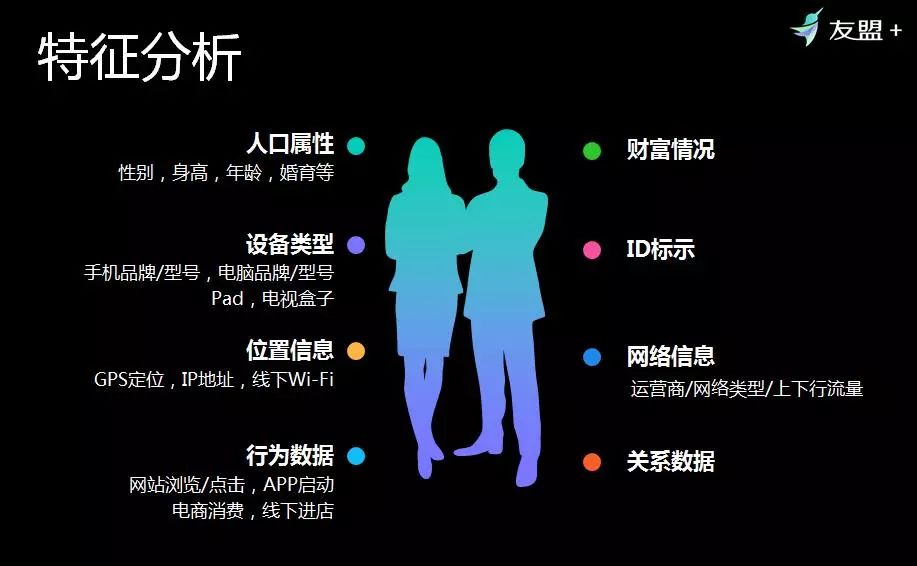 如何在这么多数据中提取跟用户相关、跟设备相关的特征?通常将特征分为四大类,第一是基本特征,比如空降的种类、数量、金额、重量、长度等;还有时间上的时长、次数、购买次数;还有比例上的,比如男女比例,平均比例等;还有复杂特征,就是将基本特征和统计特征做一个组合;还有自然特征,比如声音、图像等。