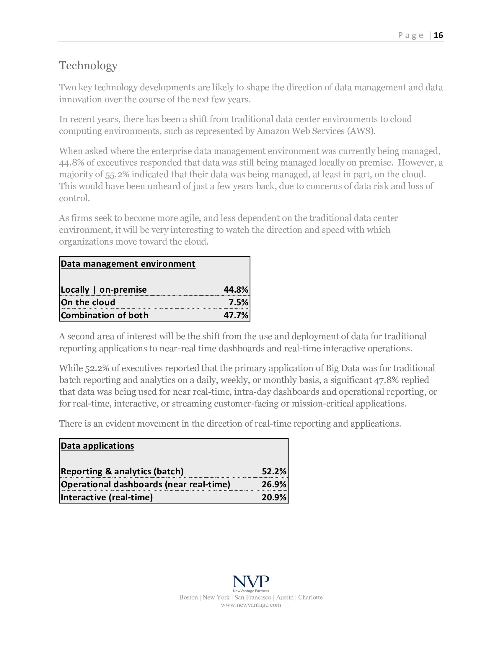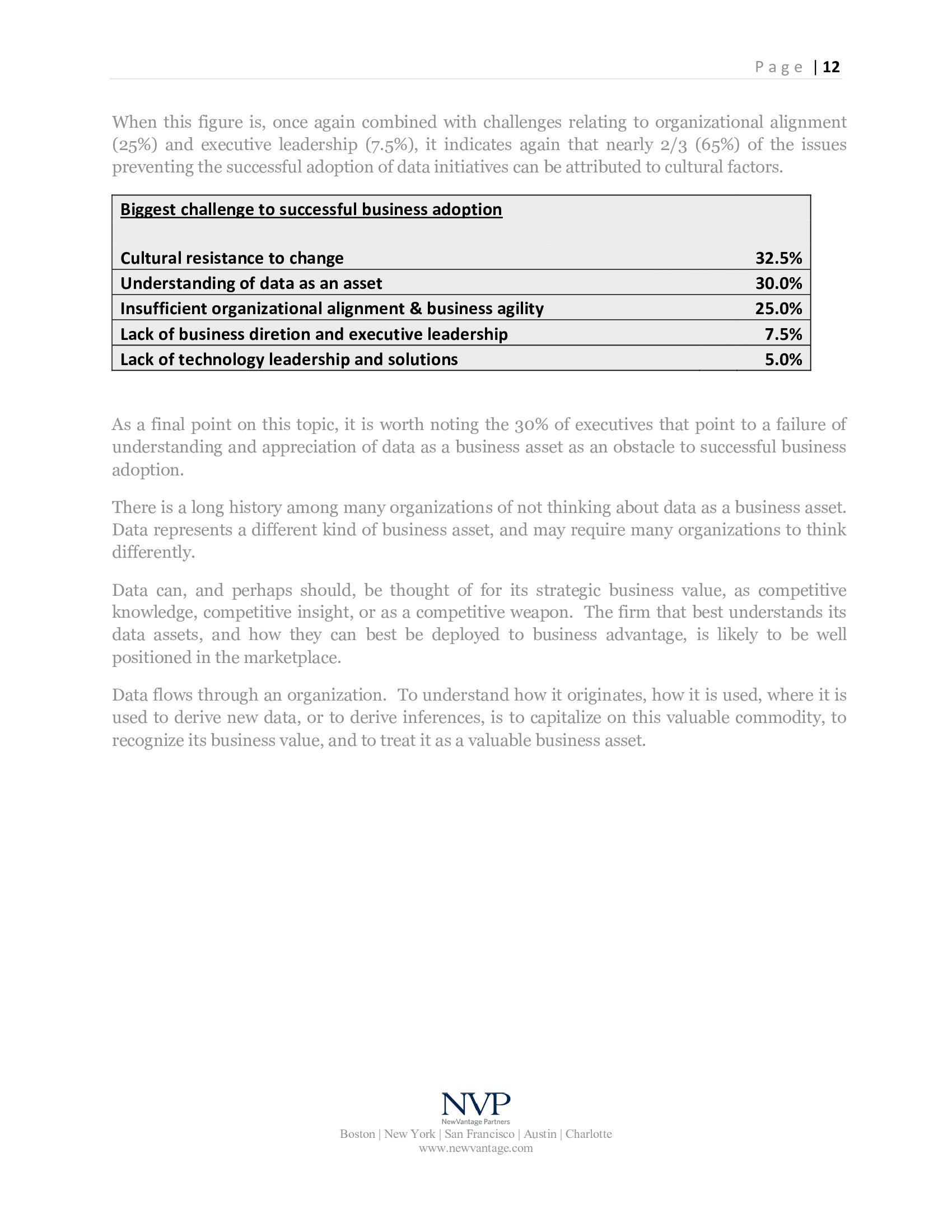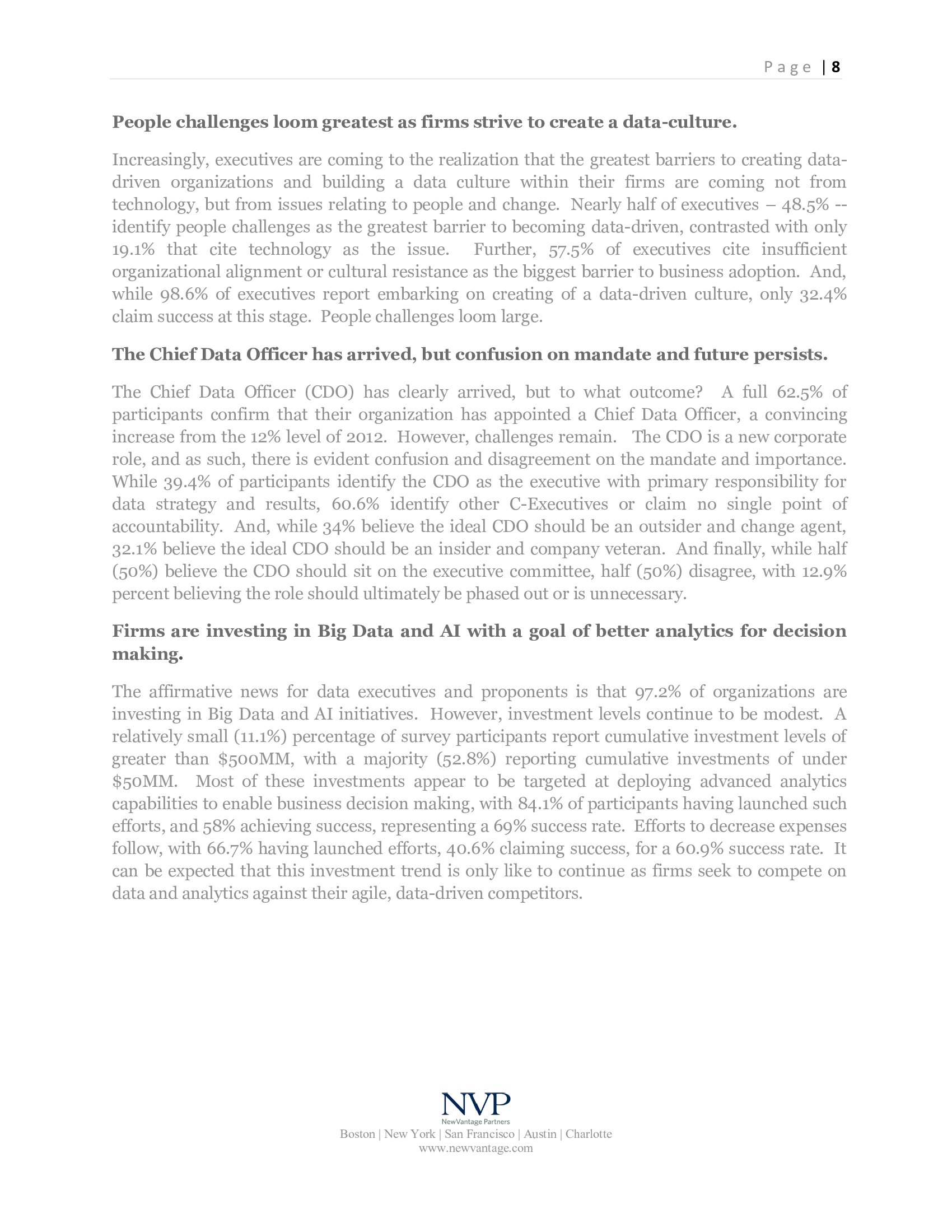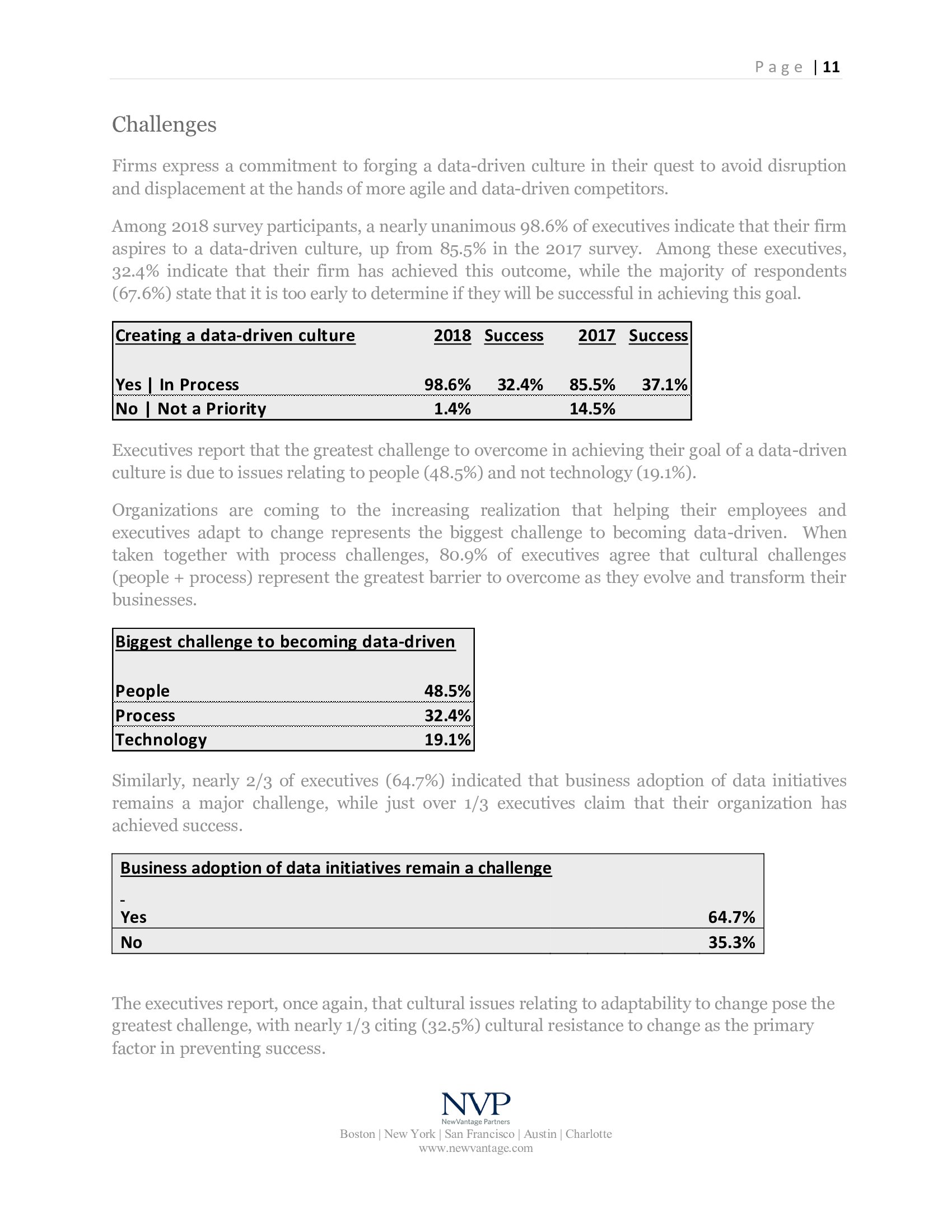 管理人员已经意识到,在企业创建数据驱动型组织和文化时,最大的障碍不是技术,而是人。近一半的管理人员认为人面临的挑战是最大的障碍(48.5%),只有19.1%的受访者认为技术是最大的问题。57.5%的高管认为企业结构是最大的障碍。98.6%的高管已经着手创建数据驱动型文化,只有32.4%的受访者取得成功。