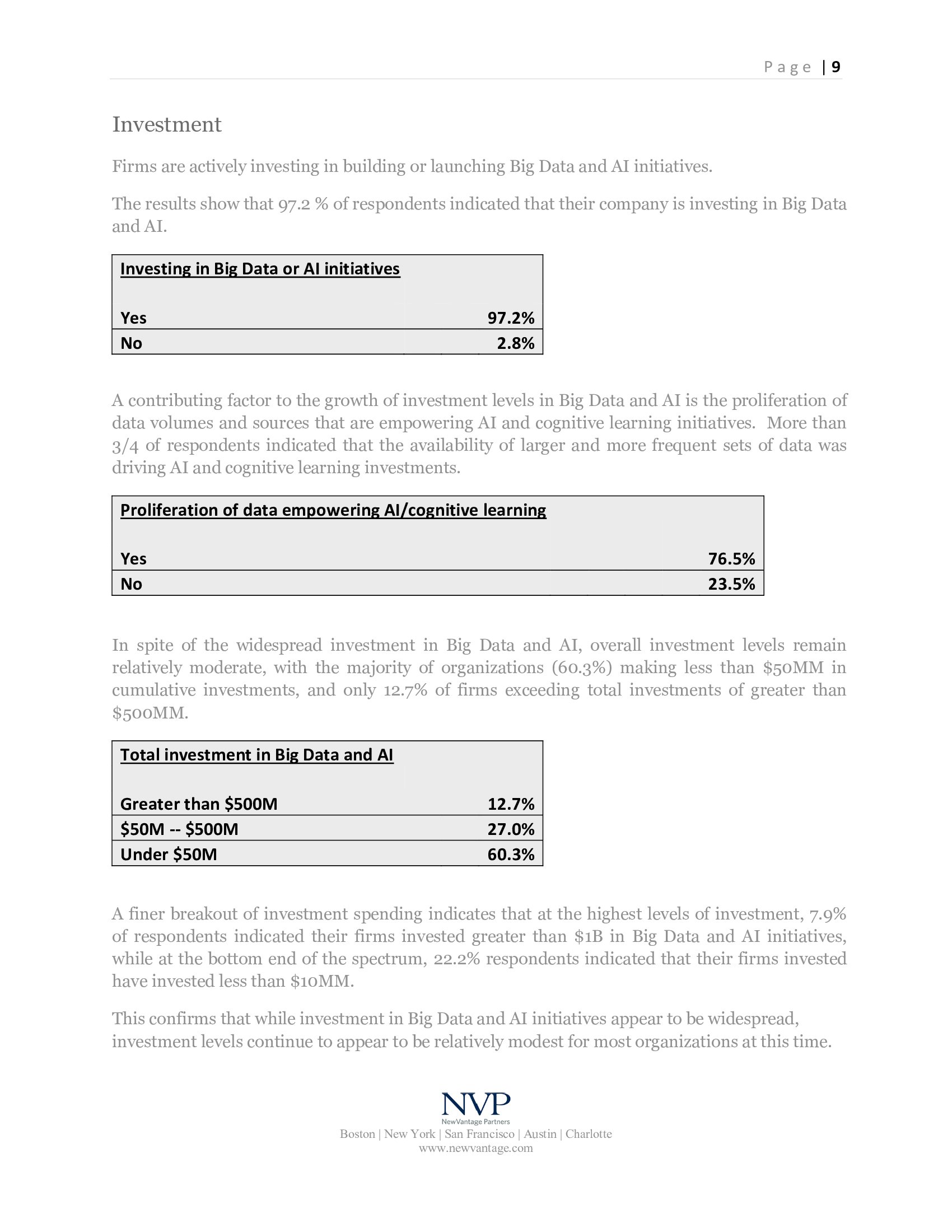 高管们认为AI已经成为一个强大的力量。97.2%的高管表示,他们的公司正在投资建立或启动人工智能计划,76.5%的受访者认为数据正在增强企业内AI和认知学习计划。认为AI是具有最强大颠覆性影响的技术的高管比例从2017年的44.3%增长至71.8%。