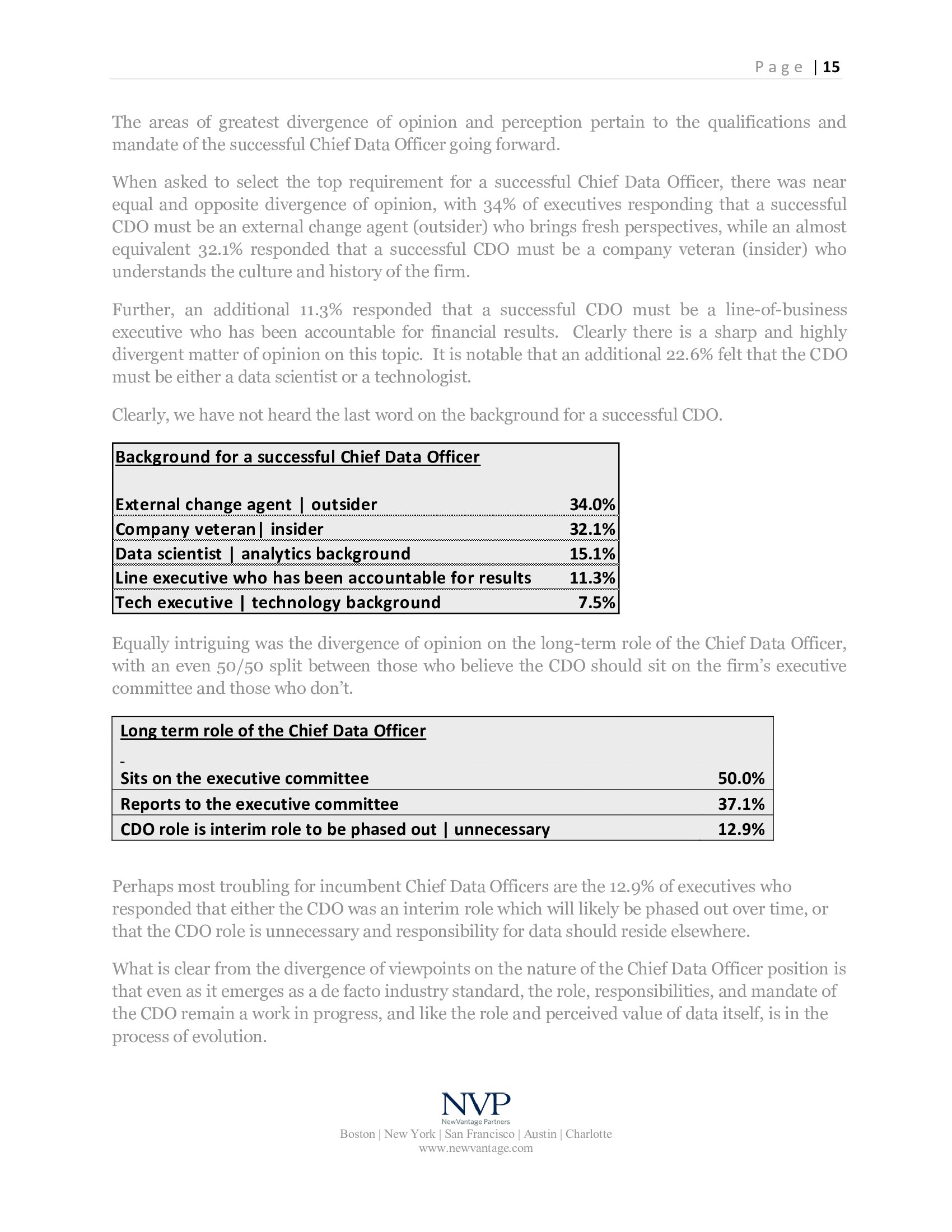 62.5%的受访者表示企业已经认命了首席数据官(CDO)。但是作为一个全新的职业,其授权和重要性方面还有很多分歧。39.4%的受访者认为CDO是负责数据战略和结果的主管,60.6%的受访者认为其没有单一的负责点。34%的受访者认为理想的CDO应该是一个局外人和变革的推动者;32.1%的受访者认为CDO应来自内部,是熟悉企业的人。一半的受访者认为CDO应该担任执行委员会成员,还有一半不这么认为。