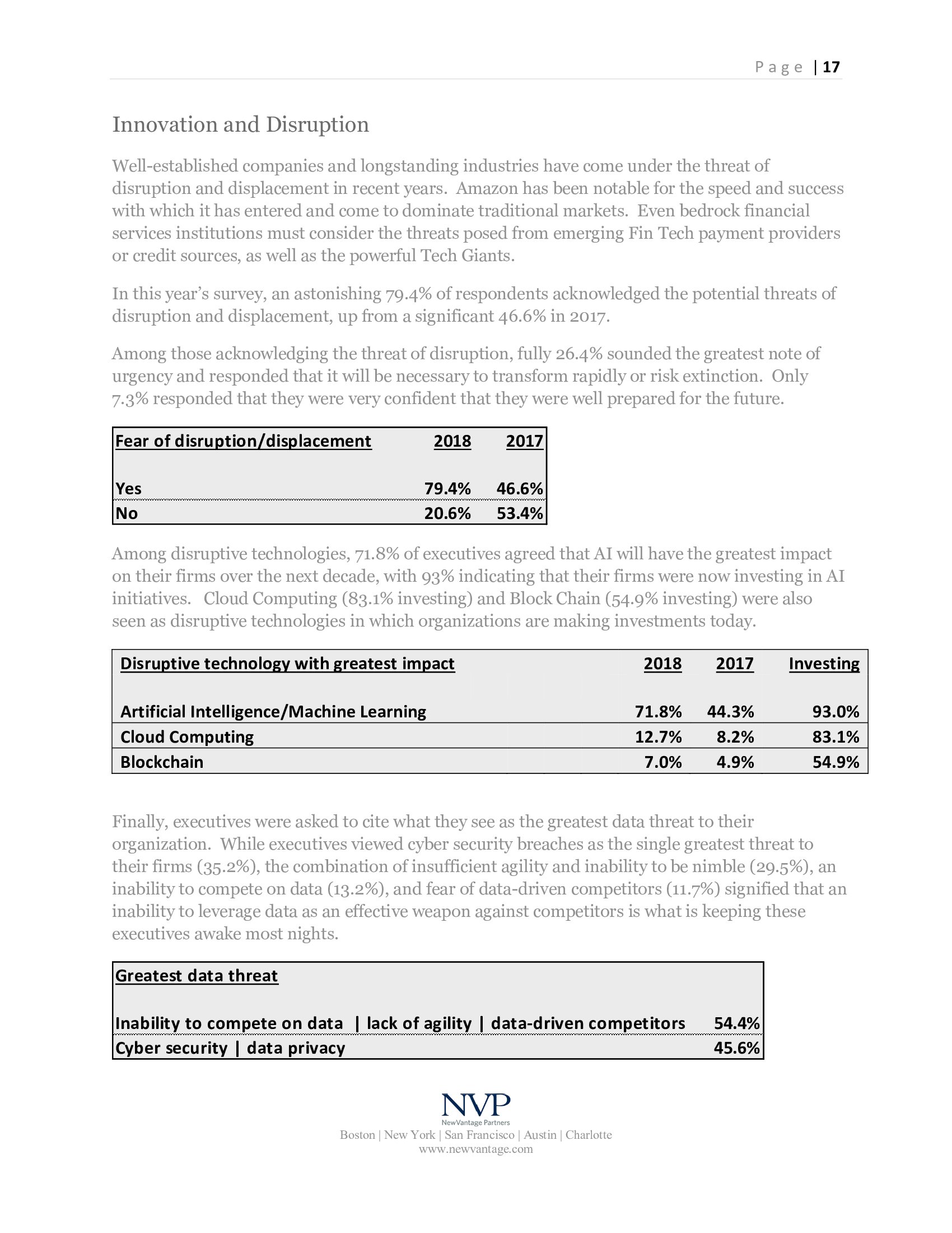 2017年的调查显示近一半的高管有这种担忧(46.6%),而这个指数在2018年的调查中上升至79.4%。高管们认为像亚马逊、谷歌、苹果和Facebook这样数据驱动的企业,以及行业内在数据和分析方面出色的竞争对手所带来的威胁正在上升。