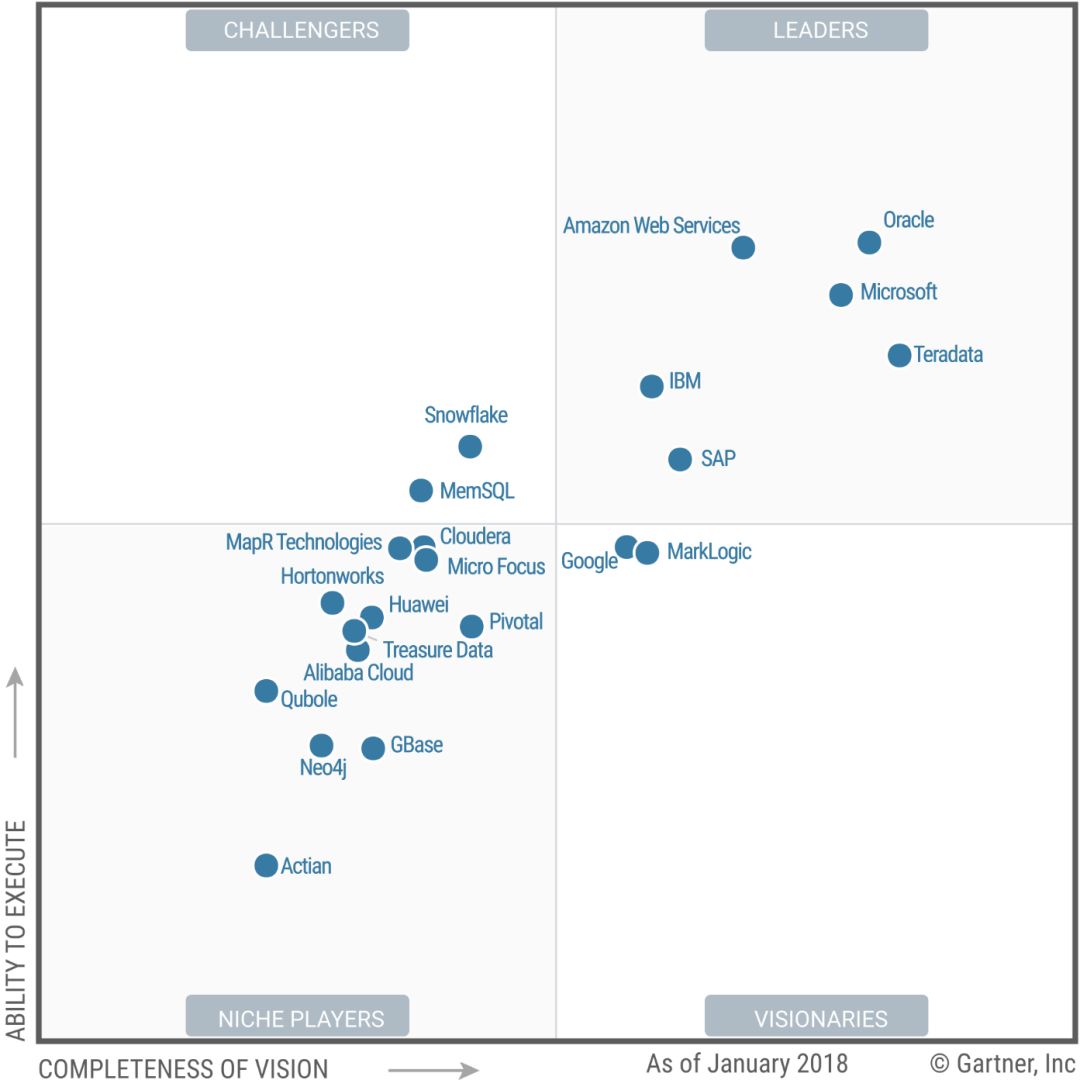 Oracle仍然领跑DMSA市场,但领先优势很小。AWS是领导者象限中上升幅度最大的,执行能力和前瞻性都有了显著的提高。这不是Oracle的问题,因为这家技术巨头厂商的地位很牢固,但AWS很可能是明年魔力象限的头号厂商。