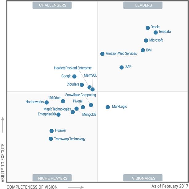 IBM的名次下滑了一点,纵轴和横轴上都有下滑。虽然这家厂商拥有广泛的分析产品组合,但Gartner认为其品牌战略令人困惑,在停滞市场的投入也有点令人质疑。Teradata接近Gartner 2017年魔力象限的顶峰,但在执行能力上差强人意。因而,微软得以超越它,如今在这个市场的一流厂商中占据一席之地。