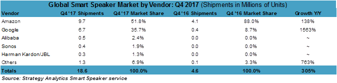 激进的折扣策略、更广泛的可选型号和价位、并在更多的国家推出带来了数百万首次买家,智能音箱市场在2017年Q4向主流市场迈出了一大步。2017年全年出货量达到3200万部,同比增长超过300%,在售出的每10部智能音箱中谷歌和亚马逊就占9款。 谷歌的市场份额在Q4增长到35%,而亚马逊的份额下降到刚刚过半。 Strategy Analytics最新发布的智能音箱研究报告《2017年Q4全球智能音箱厂商和操作系统出货量和市场存量市场份额(按区域划分)》提供了19个智能音箱厂商和11个语音操作系统的详细季度数据。