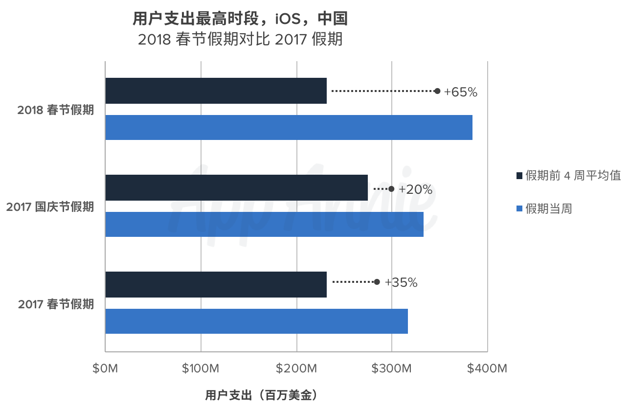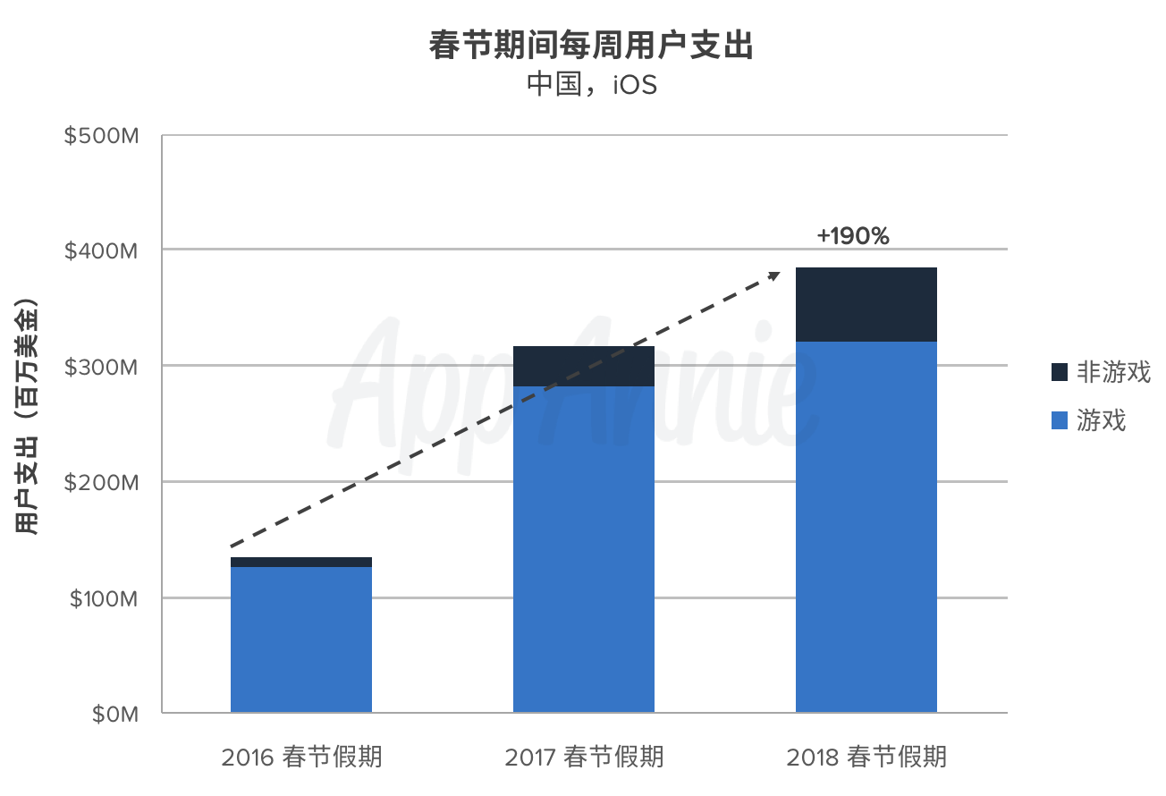 在 2018 年春节这一周,中国 iOS 每周整体用户支出创下历史新高。