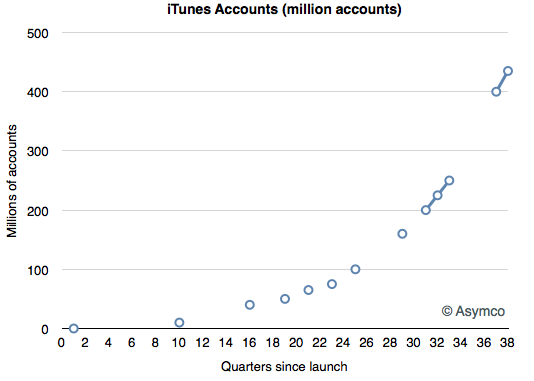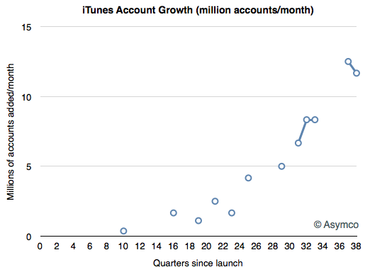 据悉,现在iTunes账号的月增加量可高达1200万个(如下图)。从iTunes的账号我们可以看到iOS用户队伍的不断壮大。