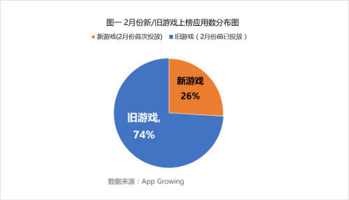 我们将2月份首次投放广告的游戏定义为新游戏,2月份之前已投放过的游戏定义为旧游戏。100款上榜游戏中,其中74%的上榜游戏为旧游戏,环比上月增加33%。受春节假期的影响,2月份开展首次广告投放的游戏游戏减少,